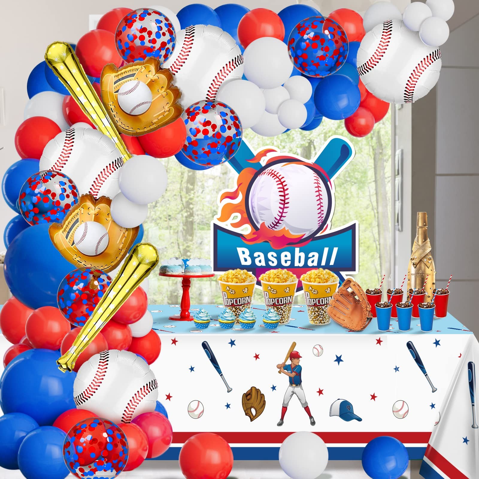 Baseball Balloon Garland Arch Kit 【Baseball Party Decorations】You will get 113 pieces of baseball party balloon garland kit. 28in baseball Bar balloon*2, 18in blue balloon*2, 18in baseball glove balloon*2, 18in baseball balloon*4, 12in confetti balloon*6, 10in red white and blue balloon*60, 5in red white and blue balloon*30, gule*5, 16Ft balloon strip*1, ribbon*1 【Unforgettable baseball themed party】Our red white and blue baseball balloon garland kit helps you throw an unforgettable baseball themed, sports themed party, liven up your party 【High quality material balloons】Red white and blue balloons are made of latex, baseball balloons are made of aluminum film, thick and enduring, please feel free to use. Warm tips: please do not inflate too full 85% or more, too full will burst, it is recommended to use air to inflate confetti balloons 【Easy to assemble】Inflate the red, white and blue confetti balloons and string them in the holes of the garland arch strip, then put the baseball cutout on the balloon or wall with adhesive dots, hang the balloon garland according to your favorite shape, you will get a beautiful balloon garland party background 【Wide application】Baseball theme party balloon garland arch kit is perfect for birthday party, baby shower, baseball game, sports party or super boy hero theme party, we are sure your family and friends will make unforgettable memories at this baseball party