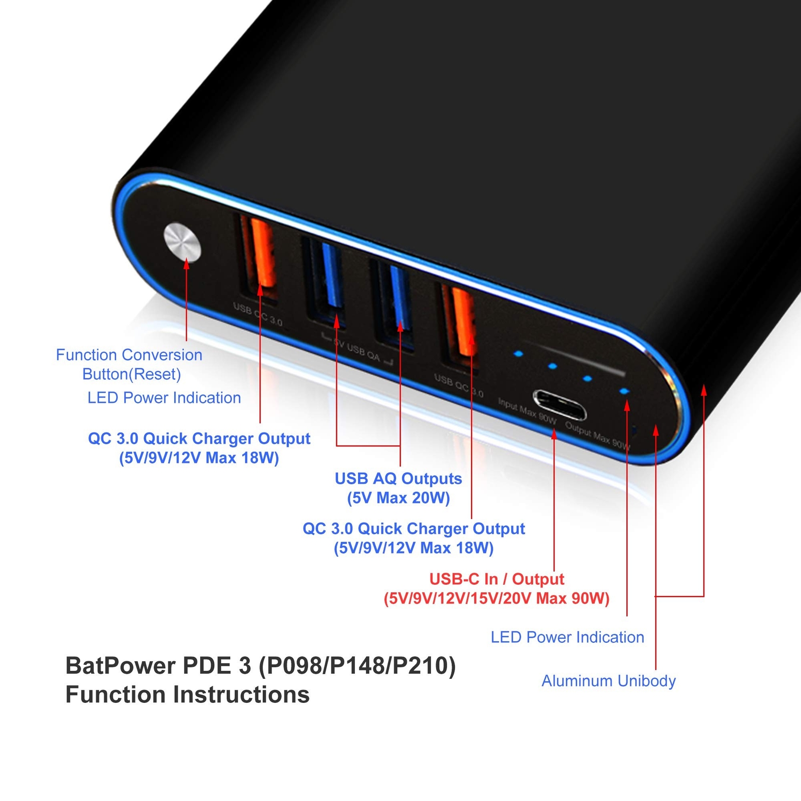 BatPower 98Wh High Power Delivery Laptop USB C Power Bank Compatible with MacBook Pro Air USB-C Laptop Portable Charger External Battery & Slim 120W PD USB-C Adapter, USB Fast Charge tablet smartphone Product Details Connector Type: USB Type C, USB, USB Type A Brand: BatPower Battery Capacity: 26800 Milliamp Hours Color: 26800mAh Special Feature: Fast,Fast Charging,Portable Charger Product Dimensions: 6.8 x 2.5 x 0.7 inches Item Weight: 14 ounces Department: 98Wh Laptop USB-C Power Bank Manufacturer: BTA POWER TECHNOLOGY Country of Origin: China Item model number: P098 Date First Available: August 15, 2020 BatPower 98Wh Laptop PD USB-C Power Bank: PD USB C Output 5V~20V (Max 90W) Compatible with Apple MacBook Pro USB C external battery MacBook Air USB-C power bank and more laptop notebook USB C portable charger, Dual USB QC output 5V~12V (Max 30W) and Dual USB QA 5V (Max 20W) fast charging for table and smartphone. BatPower 120W Slim Laptop USB-C Charger: AC Input 100V~240V 1.5A 50~60Hz, PD USB C Output 5V~20V (Max 90W) Compatible with Apple MacBook Pro USB C charger MacBook Air USB-C power adapter and more laptop notebook USB C power supply, Dual USB QC output 5V~12V (Max 30W) fast charging for table and smartphone. Dimensions: Battery 6.8x3.2x0.7(inch) / 17.2x8.1x1.8(cm), Adapter 5x2.5x0.7(inch) / 12.7x6.4x1.8(cm), AC/PD Cables: 59(inch) / 150(cm); Weights: Battery 15 (oz) / 425 (g), Adapter 9 (oz) / 255 (g). Package: 1x BatPower 98Wh/26800mAh Laptop USB-C Power Bank, 1x 120W Slim PD USB-C Charger, 1x Ac Cable, 1x PD USB-C Cable, 1x USB A to C Cable and Manual. Warranty: 30 days money back or exchange, free 18 months warranty.