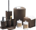 Bathroom Accessory Set - 10 Piece Brown Accessories with Product Details Package Dimensions: 11.42 x 8.07 x 7.64 inches Item Weight: 2.61 pounds Manufacturer: Bthenov Item model number: BN10P Fabric Type: Plastic Number of pieces: 10 Included Components: PU Leather Tissue Box Cover, Bathroom Vanity Tray, Trash Can, 2 Qtip Holders, Toothbrush Holder, Soap Dispenser, Toothbrush Cup, Toilet Brush and Holder, Soap Dish Plastic Bathroom Set 10 PCS - Bthenov bathroom accessory set includes 1 toothbrush holder, 1 toothbrush cup, 1 soap dispenser, 1 soap dish, 1 vanity tray, 1 trash can, 1 toilet brush and holder, 2 qtip holders, 1 leather tissue box cover. All the bathroom accessories you need for your bathroom are here. The Most Comprehensive Set - This bathroom accessories set is the last set you will ever need to purchase. With this brown bathroom set, you can organize almost everything in bathroom, making the most of your bathroom space and keeping it clean and tidy. Also suitable for living room, bedroom, kitchen, guest room, etc. Solid and Durable - The brown bathroom accessories set is made of high quality plastic, sturdy, non-friable, easy cleaning, more durable than glass or ceramic. And the 2 qtip holders made of thick clear smooth plastic are perfect organizer for small objects such as Q-tip, cotton ball, floss picks, etc. Classy and Chic Addition - The brown tissue box cover will add a touch of elegance to your bathroom, match perfectly with the rest of the brown bathroom accessories. Made of premium PU leather, easy cleaning with wet cloth. The bottom velcro belt keeps the tissue box securely and easy to replace. Perfect size (5" x 5" x 5.12") to hold most standard square tissue box. This square tissue box holder is the ideal addition to your bathroom. Attractive and Functional - Unique and minimalist look, both functional and decorative, this bathroom decor sets accessories is the finishing touch to your bathroom. The bathroom accessories sets complete will make your bathroom the place to be. Ideal for housewarming gifts, birthday gifts, wedding gifts, new house gifts, Christmas gifts, etc.