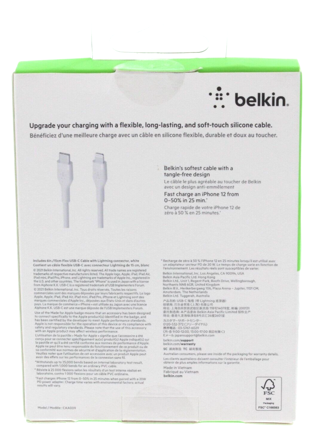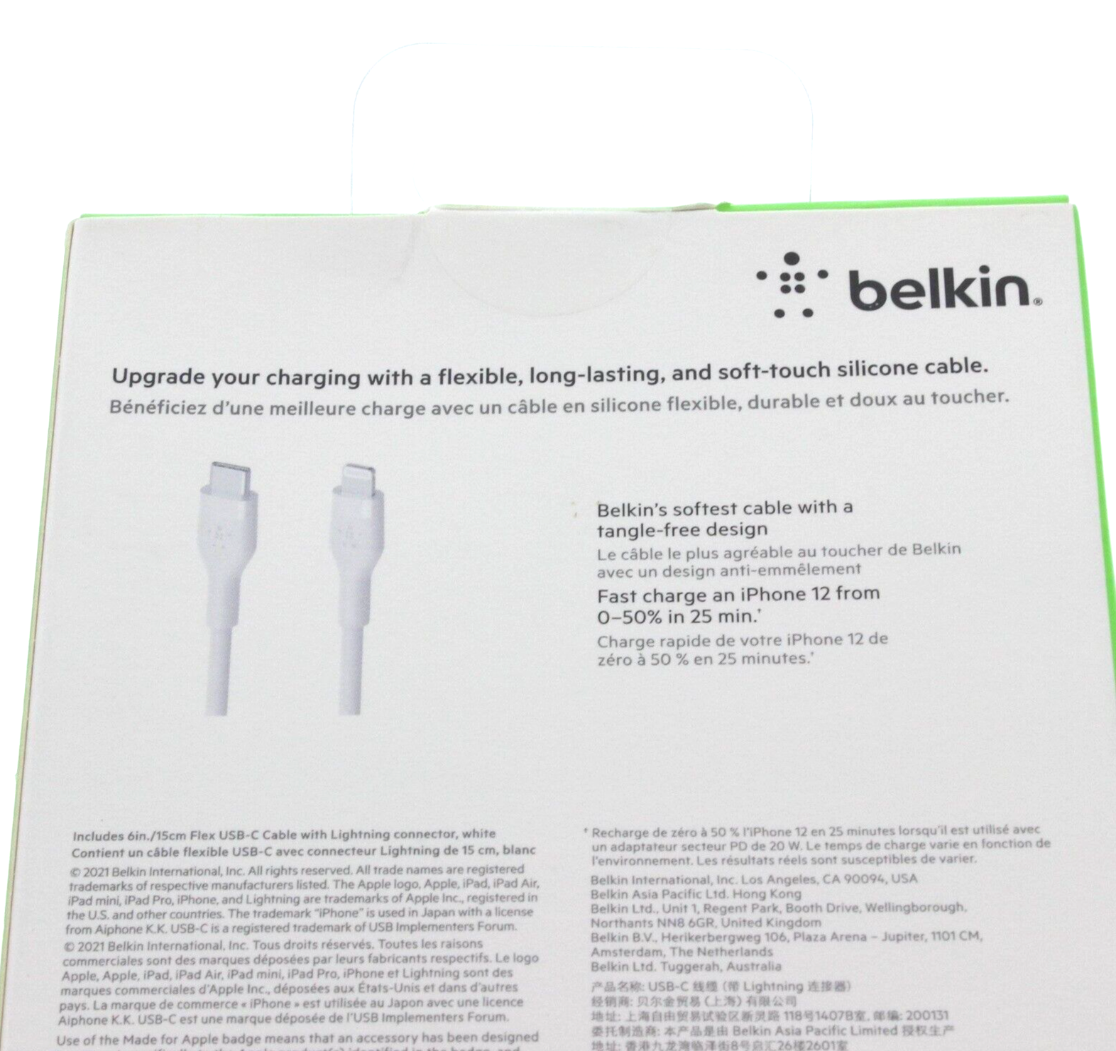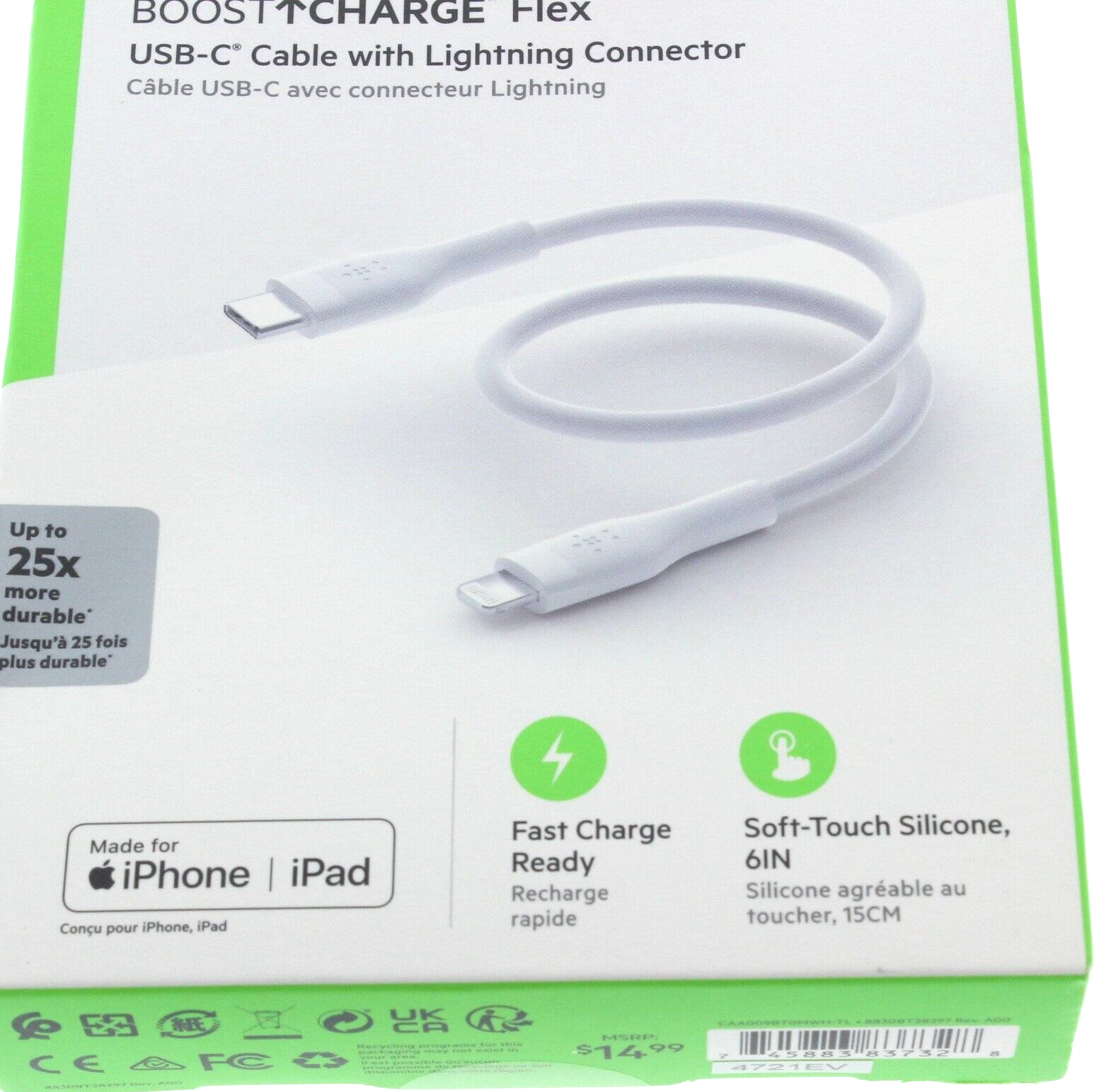 Belkin BoostCharge Flex USB-C Cable with Lightning Connector, White - New New / C0 Upgrade your charging with a flexible, long-lasting, and soft touch silicone cable Features: Belkin's softest cable with a tangle free design Fast charge an iPhone from 0-50% in 25 minutes Up to 25x more durable Made for iPhone / iPad Fast charge ready Soft touch silicone 6 inches long