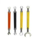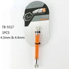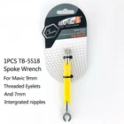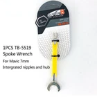 Bicycle Spoke Wrench Tools For 3.2/3.5/4.3/4.4/5.65/7mm Nipples Bike Wheel Spoke Tool TB-5516/17/18/19 •Double-ended spoke wrench, heat-treated for hardness. •Unique and comfortable handle, made of soft plastic material. •Spec: TB-5516 (black): for 3.2 mm (0.127") and 3.5 mm (0.136"). TB-5517 (orange): for Shimano® wheel system 4.3 mm and 4.4 mm nipples. TB-5518 (yellow): for Mavic® 9 mm threaded eyelets and Mavic® 6 splines of integrated nipples with 5.65 mm outside diameter and 7 mm thread nipple. TB-5519 (yellow): for Mavic® 6 splines of integrated nipples with 5.65 mm outside diameter, 7 mm thread nipple and the other end with pin spanner.