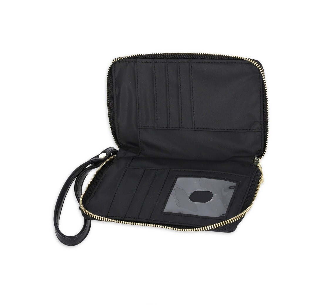 This versatile bag from Time and Tru is the perfect addition to any outfit. The cellie wallet on a string features a geometric pattern and is made of stain-resistant faux leather. It has a zip-around closure, adjustable crossbody strap, and detachable strap for added convenience. Measuring 4.5" in width, 1.5" in depth, and 7" in height, it's the perfect size for everyday use. It's ideal for travel, casual outings, formal events, and business meetings. The black hardware and strap accents give it a sleek and stylish look. This bag is a must-have for any fashion-savvy woman.