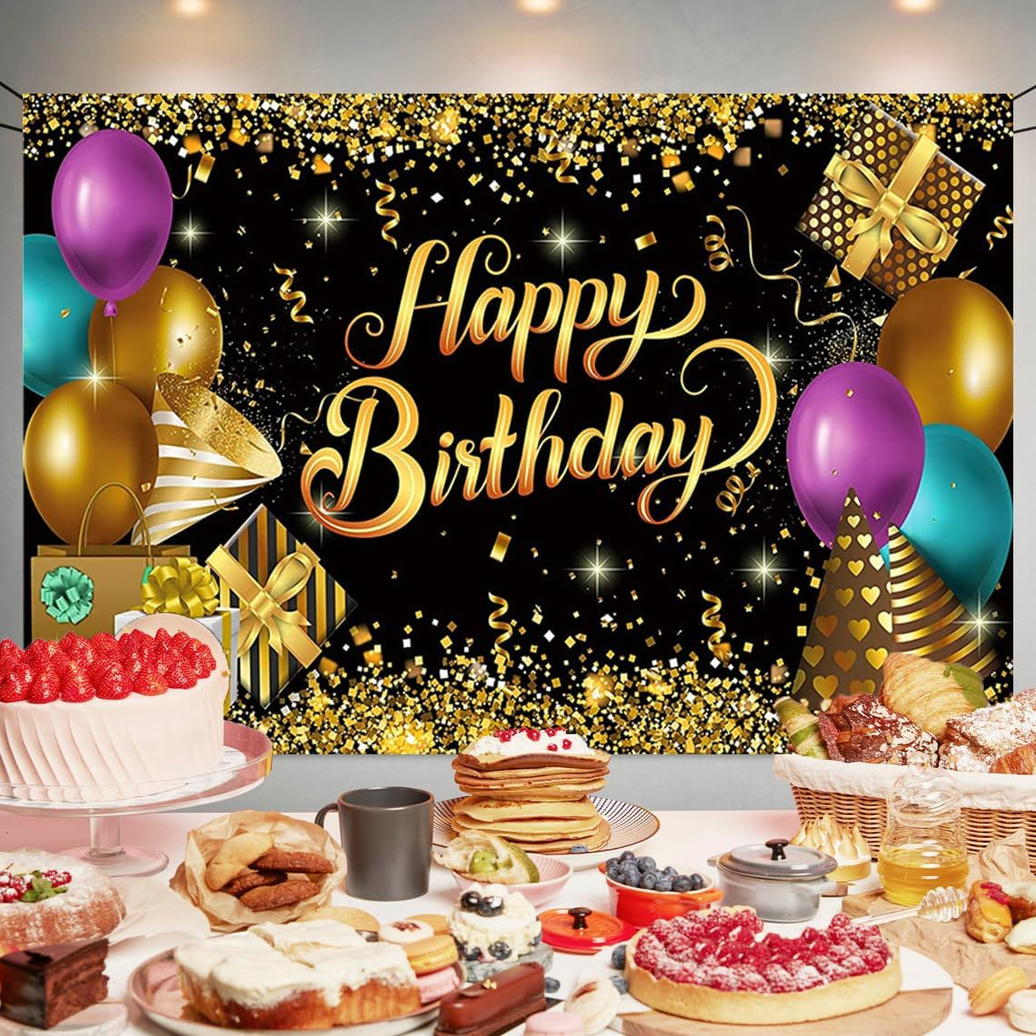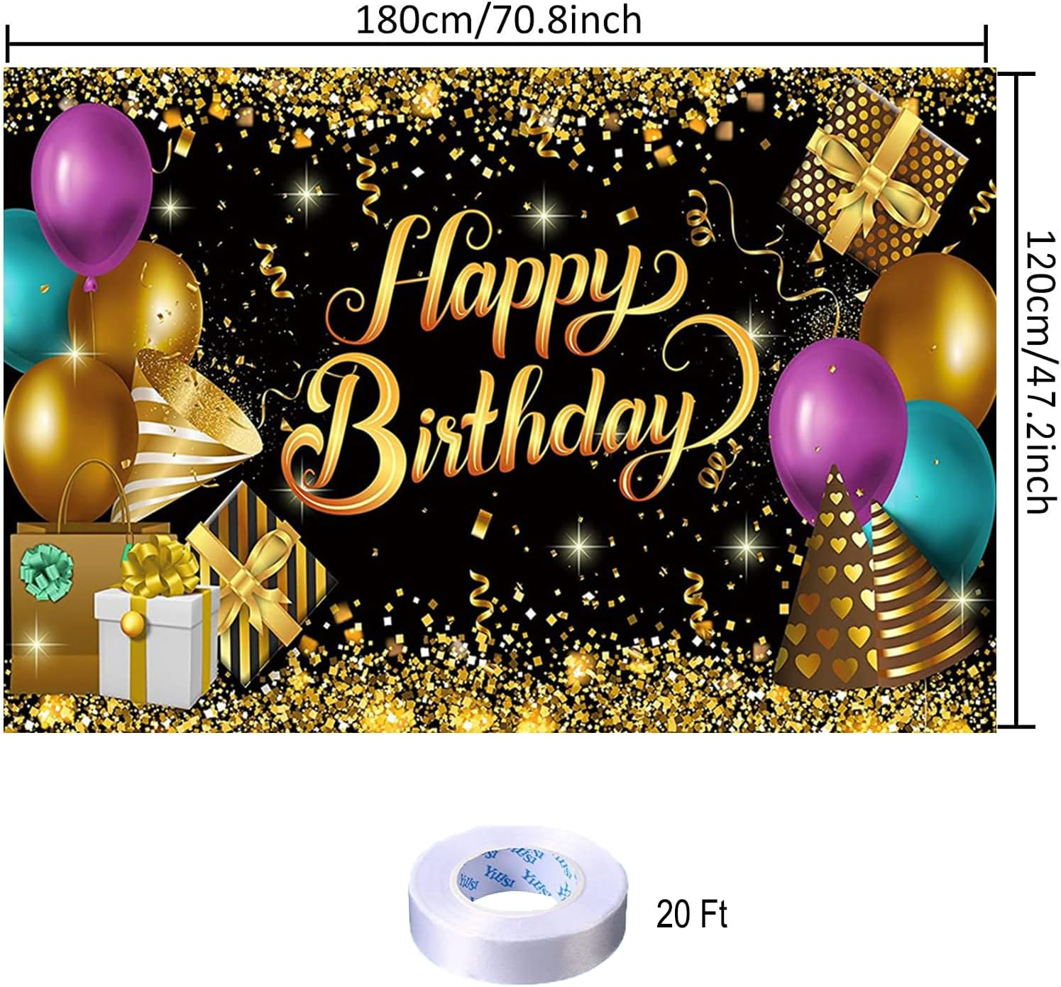 【Package Includes】You will get 1 piece of black gold backdrop, the size is about 70.8 x 47.2 inches, comes with a 20 ft white rope. Big enough to decorate your as a welcoming front door backdrop, and nicely satisfy all the photo requirements. 【Excellent Materials】The black and gold banner is mainly made of quality polyester fabric with vibrant printing, reliable and sturdy, washable and reusable, lightweight and not easy to fade, you can fold it up to easy to store for next time use after using. 【Unique Design】The black and gold backdrop is full of glitter balloons elements. It saves time and saves energy in birthday decorating, can make your big party glam and fab. 【Easy to Assemble】There are 4 copper holes respectively distributed in the 4 corners of the photography background, coming with a 20 ft white hanging rope, you can easily hang it through the copper grommets and display it anywhere you want to decorate. 【Perfect Decor】Black and gold glitter backdrop is suitable for birthday party, home decor, indoor or outdoor decoration as a photography background. The eye catching details and vibrant colors will help you light up your party and leave a deep impression on your guests. Black and Gold Glitter Birthday Party Backdrop Black and Gold Happy Birthday Banner Photography Background for Home Decorations Party Supplies 70.8 x 47.2 Inch Package Includes: 1 x 70.8 x 47.2 Inch happy birthday backdrop 1 x 20 ft white hanging string 【Unique Birthday Design】The happy birthday backdrop is full of birthday party elements. It saves time and saves energy in birthday decorating, can make your big party glam and fab. 【Easy to Assemble】There are 4 copper holes respectively distributed in the 4 corners of the happy birthday photography background, coming with a 20 ft white hanging rope, you can easily hang it through the copper grommets and display it anywhere you want to decorate. 【Perfect Birthday Decor】The backdrop is suitable for birthday party, home decor, indoor or outdoor decoration as a photography background. The eye catching details and vibrant colors will help you light up your party and leave a deep impression on your guests.