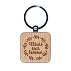 Bless This Home in Wreath Engraved Wood Square Keychain Tag Charm