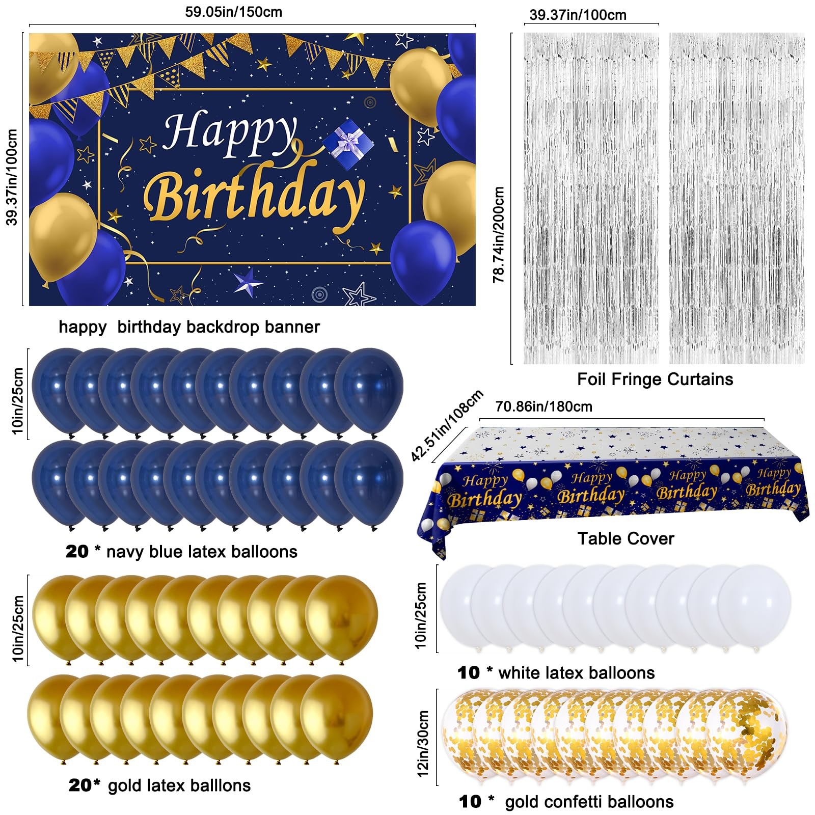 Birthday Decorations for Men & Women Including Anything You Need: happy birthday backdrop banner, happy birthday table cover, 20pcs blue latex balloons, 20pcs gold latex balloons, 10pcs white latex balloons,10pcs gold confetti balloons, 1 pack silver Foil Fringe Curtains, 10 meters ribbon and a straw. Product Specification: 100% Brand New Non-toxicity and harmlessness Inflatable: Blow, pump or helium(not included) Notice: Just need inflate them slowly, fill 90% of the balloons' space that could allow the balloon to expand completely The confetti balloons are best inflated, then shake and rub the soft surface to ensure that the confetti sticks to the sides Package List 1 Happy Birthday Backdrop Banner 1 x Happy Birthday Table Cover 20 x blue latex balloons 20 x gold latex balloons 10 x white latex balloons 12 x gold confetti balloons 1PCS 10 metre ribbon Please Note: Due to the different monitor and light effect, the actual item might be slightly different from the colors show on the pictures; Please allow 1-3cm errors because the manual mearsurement, thanks for your undestanding Pay attention: Children under 8 years can choke or suffocate on flat or broken balloons. Adults supervision required. Please keep flat balloons from children. Discard broken balloons at once. 🎉Birthday decorations for Men & Women: The party supplies included happy birthday backdrop banner(59"*39.37"), happy birthday table cover(70.86"*42.51"), 20pcs blue latex balloons(10"), 20pcs gold latex balloons(10"), 10pcs white latex balloons(10"),10pcs gold confetti balloons(12"), 1 pack silver Foil Fringe Curtains, 10 meters ribbon and a straw. 🎉Blue and Gold Birthday Decorations: Do you want to create a special birthday party? Do you want to leave an impressive party memory? The theme of blue & gold birthday decorations is your best choice: the blue and gold are fashionable and elegant colors that will give you a lovely party. The party supplies suit for first, 10th, 13th, 15th, 16th, 18th, 21st, 30th,40th, 45th, 50th, 60th etc birthday party. 🎉Happy Birthday Decorations for Girls 21st: The gold and blue party decorations are full of joyful atmosphere. You can use the birthday supplies kit to decorate your birthday party background. If you have any problem with Happy Birthday decorations supplies please do not hesitate to back by , we will try our best to help you resolve it. Hope you have a good shopping experience at . 🎉Birthday Party Balloons for Any Age: It is easy to assemble and inflate: 59"*39.37" happy birthday backdrop banner;70.86"*42.51" happy birthday table cover, 10" latex balloons;12" confetti balloons. The confetti balloons are best inflated, then shake and rub the soft surface to ensure that the confetti sticks to the sides. 🎉High Quality Women & Men Birthday Party Decorations Supplies Kit: Birthday party pack supplies are made of premium Aluminium Foil material, thicken, non-toxic and eco-friendly. Our birthday party balloons are easy to inflate and, support both air and helium. Note: Please do not inflate too much air be careful with how much pressure with helium. Our happy birthday banner is made of polyester fabric, very nice with pretty red and black colors, sturdy and reusable. 🎉Blue and Gold Party Decorations for Men:You can put these party decorations kits on the wall, bedroom, room, ceiling, window, garden or in courtyard. It very suitable for home, hotel, indoor or outdoor. And the luxurious foil balloons very prefer for party city, it can make the different atmosphere for different occasions. 🎉Disposable Birthday Tablecloth is easy to clean: The tablecloths are made of sturdy and thick quality plastic material, printed with exquisite balloons and star, very beautiful, not easy to tear, safe and reliable to use. It is the great birthday decorations for for friend, son,brother,daughter, dad ,mom, father,mother, wife, husband, grandmother, grandfather etc. 🎉Funny Birthday Party Backdrop for Girls and Boys is easy to assemble and inflate: You can blow the balloons, or also use the pump/ helium gas (not included) to inflate which will help you easier and quicker to finish inflate. Each balloon apr 12inch after inflated. Bunting banner needs to use the ribbon to put them together then hang them on the wall, ceiling, or curtains. Rubbing the confetti balloons by hairs, cloth, wool, or carpet, or shake the balloons after inflating.