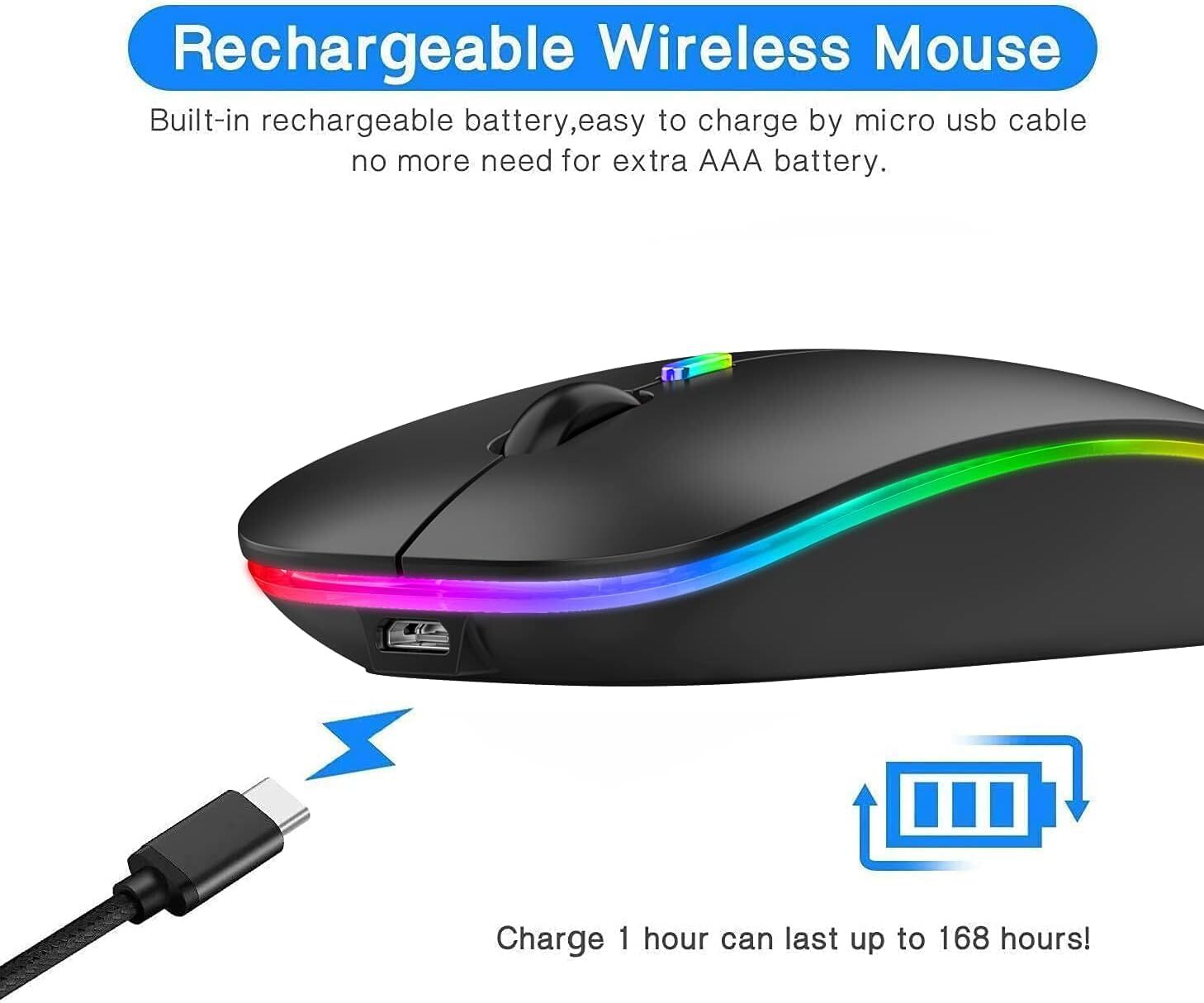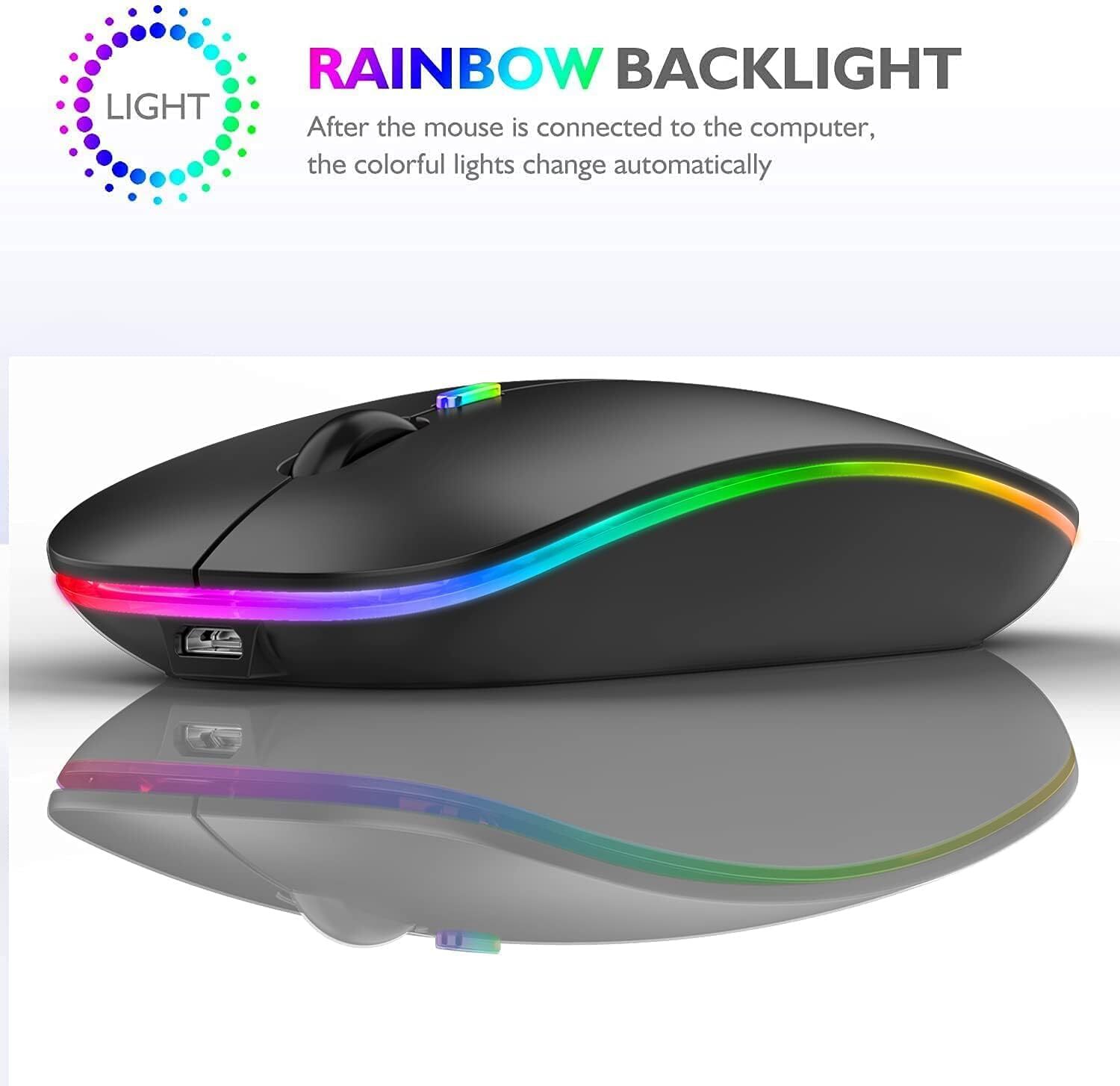 Please charge the mouse for about 2 hours, before using the mouse for the first time. Bluetooth Mouse + 2.4G Wireless Mouse, one mouse, two devices, one key switch. How to use the 2.4G mouse: Take out the USB receiver, insert it into the USB port of the PC or laptop, turn on the mouse switch to 2.4G mode, wait for a few seconds, you can start using it. How to use the Bluetooth mouse: Turn on the mouse switch to bluetooth mode, then turn on the bluetooth switch of the notebook, click and select "Add Device" (only need to turn on the bluetooth switch on tablet), search for a bluetooth mouse, and then click BT5.2 mouse, the connection is successful and you can start using it. Bluetooth mouse compatible with more than 99% Bluetooth devices, such as Macbook Pro 2021/ 2020/ 2019/ 2018/ 2017/ 2016, Macbook Air 2022/ 2020/ 2019/ 2018/ 2014, iMac, Mac Pro, Mac Mini, iPad 10.2/ 9.7 inch, iPad Pro 12.9"/ 11"/ 10.5"/ 9.7", iPad Air 10.5/ 10.9/ 9.7 inch, iPad mini 6/ 5/ 4 8.3''/ 7.9'', iPhone 13 Pro Max, iPhone 12 Pro Max, iPhone 11 Pro Max, etc. Note: 1. For iPad or iPhone, please update your system to iPad OS 13 / iOS 13 / Mac OS 10.11 or above, and enable the Assistive Touch: Setting - Accessibility - Assistive Touch. 2. The mouse cursor moves slowly or stops moving when the mouse battery is low. Please charge in time. 3. The green light will turn on when charging, and turn off when fully charged. Package: 1 * Wireless Bluetooth Mouse 1 * USB Charging Cable 1 * USB Receiver (stored at the mouse bottom) 1 * User Manual Service Support: We provide you with 12 months warranty and 24-hour email contact service. If you have any questions or needs, please feel free to contact us. We aim to provide you with the most satisfactory customer service. DUAL MODE BLUETOOTH MOUSE(BT 5.1 + 2.4GHz): With dual mode connection, the mouse realizes free switches between two devices with one mouse only by pushing the switch.【Please turn on the "Assistive Touch" on iPad: Setting-Accessibility- Assistive Touch for an iPad usage.】 Colorful Backlit Design: The mouse comes with LED lights, which can automatically change a variety of different colors, adding more fun to boring work and life. The soft and bright lighting creates a cool and exquisite atmosphere for work & play. The LED light can't be turned off when you are using it. The nano receiver is stored on the bottom of the mouse for easy portability Comfortable and Silent Clicks: Good surface coating provides you with a comfortable and skin-friendly feel. The mute button reduces noise by 90%, making it an ideal quiet mouse for office, home, conference room, library, travel, so you can focus on work, study without disturbing others. 3 adjustable DPI (800/ 1200/ 1600 DPI), freely to satisfy daily work. High-definition optical tracking enables responsive cursor control for precise smooth tracking. Slim and portable design, easy to carry UNIVERSAL COMPATIBILITY: The Bluetooth Mode is compatible with Windows 8/Windows 10, iPad/iPhone iOS 13 and above, Mac OS 10.10/Android 5.0 or above system, it's easy to pair and connect. 2.4Hz Wireless Mode works with computer, laptop, desktop with USB, type-c port, plug and play. 【BUILT-IN BATTERY AND AUTO ENERGY-SAVING】The mouse built-in rechargeable battery, with a charging cable. No need to change batteries.To saving power, the mouse will fall asleep after 10 minutes no-operation, it can be waken up by clicking any button.