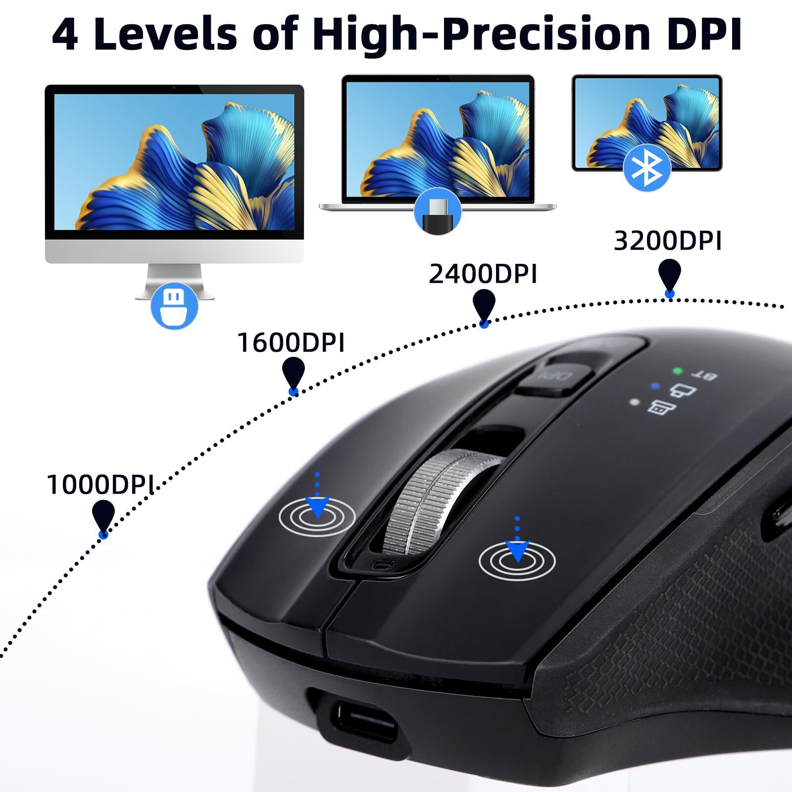 3 Devices with A Single Clicking: This portable wireless mouse is able to connect to 3 devices (2.4G USB-A Wireless + 2.4G USB-C Wireless + Bluetooth) at the same time. You can switch between 3 devices with a single button clicking.Simple & convenient to work from the desktop to the laptop, or tablet to Macbook, chromebook, etc. Comfortable Ergonomic Design: Soft easy-to-grip thumb rest,this Bluetooth mouse is perfect to fit your hands, providing more comfortable user experience.The computer mouse wireless is medium-sized and is very convenient to carry on trips or outings(Warm tips: If your palms are larger and like an oversized wireless bluetooth mouse, please consider carefully). 4 Adjustable DPI Levels: To meet the needs of different groups, wireless mouse for laptop with 4 levels of DPI (1000/1600/2400/3200), and comes with a Nano USB A USB C receiver (stored in the back of the wireless mouse ). No need for any driver, and you can plug and play the computer mouse wireless directly. Long Life Rechargeable Battery: The Bluetooth mouse adopts a Type-C charging port,lithium battery with an industry-high capacity lasts for 60 Days with single charge (based on 2 hours' non-stop use per day). Silent clicking allows you to work in the office, home, cafe, library without disturbing anyone around you. Hassle-free & High Compatibility: Our rechargeable bluetooth mouse is suitable for desktop, laptop, tablet, smartphone, iPad, Macbook, and compatible with various operating systems (Windows, Linux, Mac, Chrome, iOS, Android). When connecting a new device, press and hold for three seconds to make the Bluetooth indicator blink rapidly, and Bluetooth will be activated.It can connect to your device via USB port and Bluetooth.