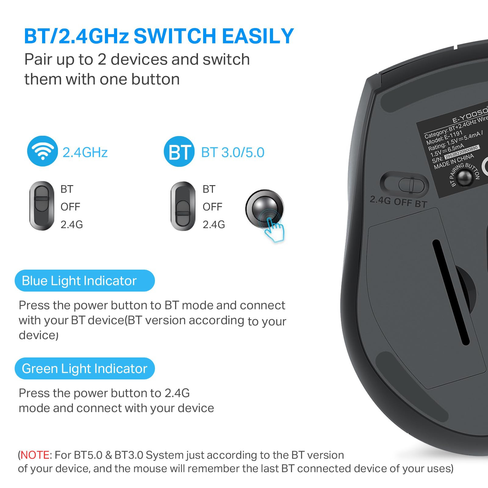▶[5 DPI LEVELS & 6 BUTTONS]: E-1191 bluetooth mouse mouse for laptop has 5 Adjustable DPI Settings, 800, 1200, 1600, 2000 and 2400, that allow you to freely control the mouse speed. Extra 2 Side Buttons ideal for both work and gaming. Six efficient buttons and five adjustable DPI level that allow you to freely control the mouse speed to meet your multiple needs for daily work or others. ▶[MOUSE OF CHOICE FOR MULTI-DEVICE USERS]: Provide Bluetooth modes and 2.4GHz wireless nano receiver connection method, the mouse can connect 2 devices and switch at any time, this bluetooth wireless mouse realizes free switches between 2 devices only one switch. Simple and convenient to work from the desktop to the tablet, or laptop to Macbook, ect. ▶[ANTI-SLIP & ANTI-SWEAT ERGONOMIC DESIGN]: Ergonomic Wireless Mouse is made of anti-slip and anti-sweat custom material, super durable. And the ergonomic design and soft rubber grip perfect to fit your hand for a comfortable grip while reducing wrist fatigue caused by long working hours. The compact size makes it easy to take with you whether you use your computer at home, at work or anywhere else. ▶[UNIVERSAL COMPATIBILITY & WIDE USE] : Wireless Mouse Well compatible with Windows XP, Vista, 7, 8, 8.1, 10, 11, Linux and Mac OS (V10.4 or higher); as well as compatible for desktop, laptop, PC, MacBook, Chromebook and other Bluetooth mouse supported devices. Great Bluetooth computer mice for various activities! ▶[ LONG BATTERY LIFE]: 1 AA battery lasts up to 24 months, wireless computer mouse saves time and money by practically reducing the need to change batteries (battery life may vary based on user and computer conditions). Smart auto-sleep mode saves power, the wireless mice will enter energy-saving mode after 1 minute of inactivity, or enter sleep mode after 8 minutes of inactivity. (To wake up: just double-click any button). ▶[12 MONTHS WARRANTY SERVICE]: Our bluetooth wireless computer mouse provides 12 months warranty service, even after the Amazon return period, if you have any questions, please feel free to contact our professional customer service team, we will reply you within 24 hours and help you until solve all questions.