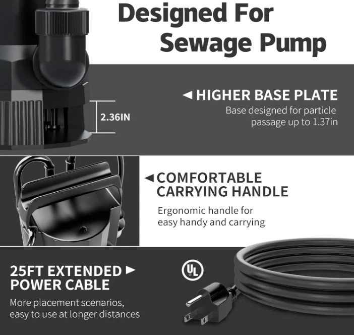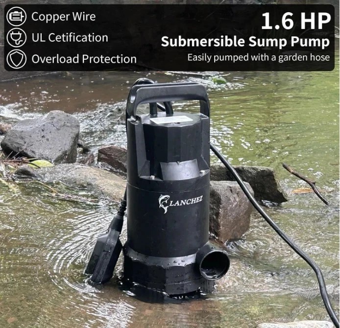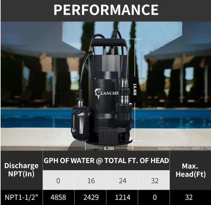About this item 【Efficient Sump Pump】LANCHEZ submersible water pump with 1.6 HP motor to ensure sufficient power both reduced more energy efficient and noice. Discharge water up to 4858 GPH(81 GPM), lift water up to 32 ft vertical height. High baseplate design for particle passage up to 1.37 in, say goodbye to draining woes, easily adapts to sewage environments 【Easy to Use】Automatic float switch, body with no button design, just drop the pump in the water and plug it in, and the float switch can control on and off with rises and lowers with the water level. Constructed with a high quality and impact resistant thermoplastic casing, which makes it robust and corrosion resistant. Built-in automatic thermal overload could protect the water pump from damage for work for continuous work 【Good Compatibility】The convenient handle on the top makes it easy to carry it around. NPT 1-1/2" discharge comes 3/4'' NPT garden hose adapter, 1-1/2'' NPT elbow adapter and multi-hose adapter, easy to accommodate several hose sizes. And equipped with 16 ft power cable, it can be used in a wide range of applications without the need for an extension cord 【Wide Application】Submersible pump with IPX8 waterproof and PA66 material impeller, suitable for hot tub, water tank, and remove water from swimming pool, standing water in basement, cellar or sump pit, rain barrel, and other flooded areas 【Quality Service】With rigorous manufacturer testing. Includes 3-year technical support and professional assistance 【Tips】Before using the pump, submerge this pump into the water at an inclined angle to remove excess air. Support automatic start/stop, and attention to float switch activation requirements Shipping We offer FREE shipping on all orders! We ship within Three business days of payment, usually sooner. We use a selection of shipping services such as UPS, FedEx, USPS etc. We only ship to the lower 48 states, no APO/FPO addresses or PO Boxes allowed. Local pickups and combined shipping options are not provided at this time. Return You can return a product for up to 30 days from the date you purchased it. Any product you return must be in the same condition you received it and in the original packaging. Please keep the receipt. Payment We accept payment by any of the following methods: PayPal Please pay as soon as possible after winning an auction, as that will allow us to post your item to you sooner! Feedback Customer satisfaction is very important to us. If you have any problem with your order, please contact us and we will do our best to make you satisfied. Contact Us If you have any queries, please contact us via ebay. We usually respond within 24 hours on weekdays. Please visit our eBay store to check out other items for sale! Thank you for shopping at our store. Disclaimer We are working with different suppliers in USA to deliver the item to your doorstep. If you have any issues regarding the item, Feel free to ask.