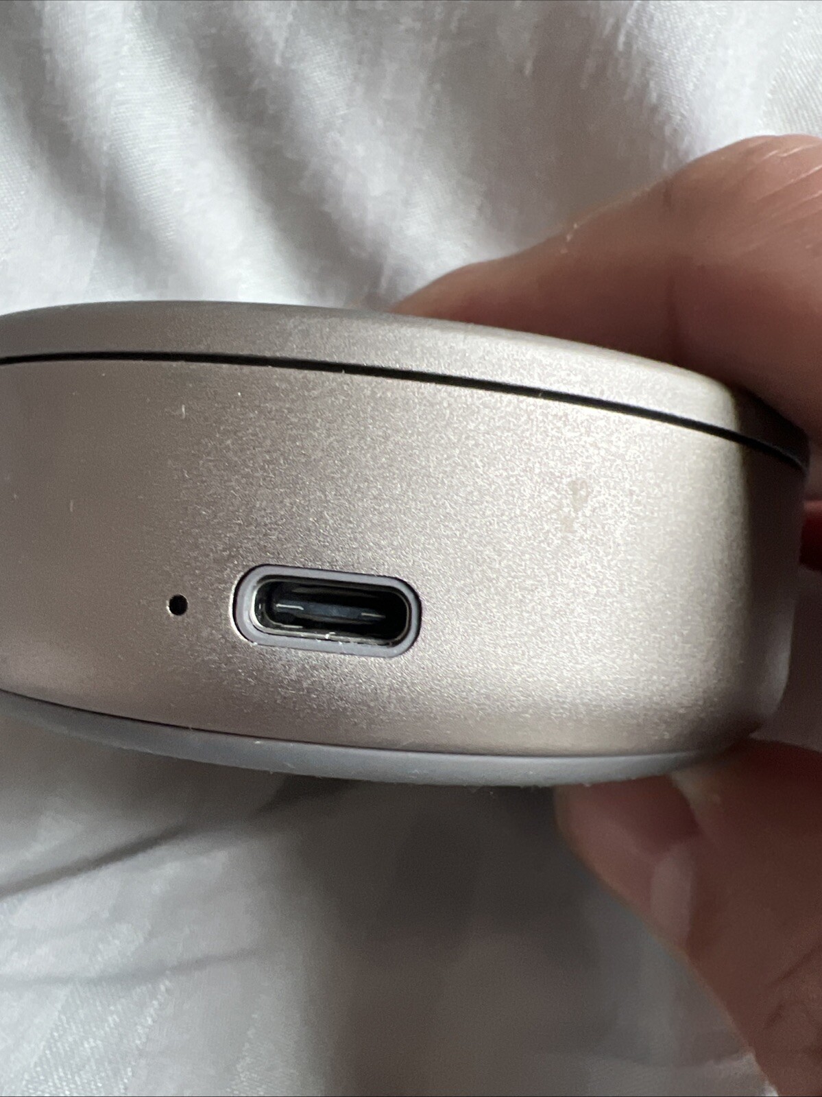 The Bose Sleepbuds II Wireless Earbuds in Silver have a unique design for sleep and relaxation, featuring noise-masking technology and ambient sound mode. These in-ear earbuds offer Bluetooth connectivity, a rechargeable battery, wireless charging capability, and a built-in microphone. The left earbud may have a defect where it sometimes has connectivity issues. The sleek silver and white color combination and the advanced features make these earbuds a convenient choice for those looking to enhance their sleep experience with high-quality audio technology. Charging case is perfect