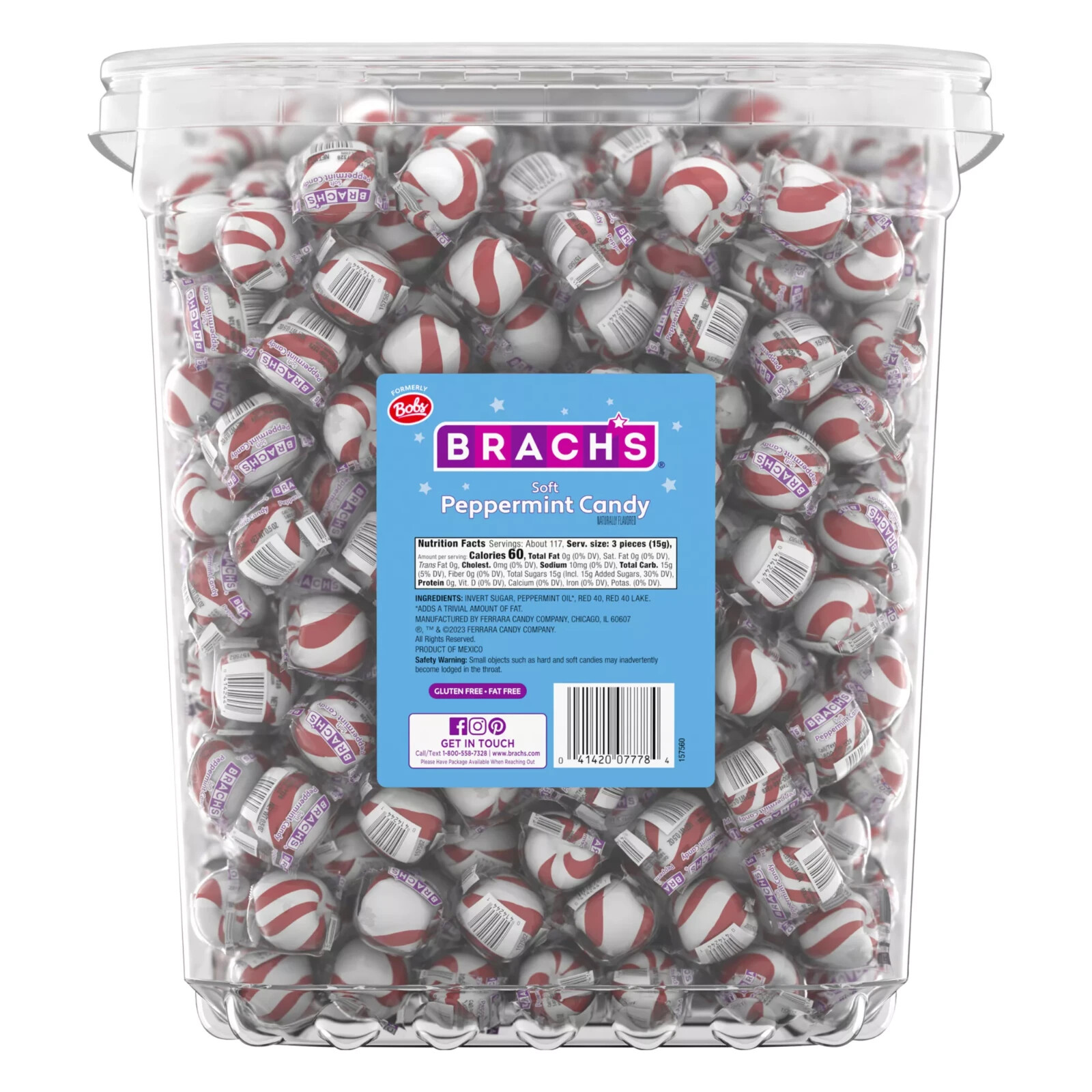 Brach's Soft Peppermints are truly unique, made with invert sugar giving each piece a smooth, consistent texture that melts in your mouth, and flavored with triple distilled peppermint oil. Product Features: One container of 350 pieces of Brach's Soft Peppermint Candy Made with real peppermint oil Individually wrapped Perfect post-meal treat Fat-free and gluten-free Includes soft peppermint candies, 350 ct. Ingredients: Sugar, Peppermint Oil, Red 40, Red 40 Lake. Product Warnings and Restrictions: Safety Warning: Small Objects Such As Hard And Soft Candies May Inadvertently Become Lodged In The Throat.