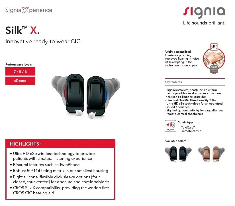 S igni a Silk 1X Instant Fit CIC Hearing Device | Nearly Invisible | Genuine | Right / Left / Pair | 2 Yr Warranty The S igni a Silk 1X is one of the smallest and most discreet hearing device available today. It fits instantly—no ear impressions needed—and sits comfortably inside your ear canal for an almost invisible look. Built on the advanced Signia Xperience Platform, the Silk 1X delivers excellent speech clarity, reliable noise reduction, and natural-sounding audio in daily listening environments. Whether you order Right, Left, or a Pair, you receive a 100% authentic, fully tested hearing aid with a 2-year warranty and free programming support if you share your audiogram. ⭐ KEY FEATURES (SILK 1X) 🎧 Comfort & Design • Instant Fit CIC—very small and discreet • Soft silicone Click Sleeves for all-day comfort • No custom mould required 🔊 Sound Performance • Sound Clarity technology for natural sound • Speech & Noise Management • Dynamic Soundscape Processing (Xperience engine) • SoundSmoothing™ for sudden loud noise reduction • Feedback cancellation for whistle-free performance 🎚 Processing • 16 channels • Extended frequency range • Stable performance in indoor/outdoor environments 📱 App Control • Compatible with Signia App (iOS & Android) • Adjust volume and programs directly from your phone 🎵 Additional Features • Tinnitus therapy functions • HD Music presets • Wireless CROS/BiCROS compatible (with Silk X Transmitter – optional accessory) 📦 PACKAGE CONTAINS (We ship exactly what the customer selects — Right / Left / Pair) • 1× Signia Silk 1X Hearing Device (Right / Left / Pair) • 1× Size 10 battery (pre-installed) • Click Sleeves (multiple sizes) • Cleaning tool • User manual • Storage case • 2-Year Warranty🚢 Shipping Policy Processing Time: All orders are processed and shipped within [1-3 Business Days] of cleared payment. Carrier: We ship via [e.g., USPS First-Class, USPS Priority Mail, DHL, FedEx, UPS] with tracking provided for every order. Packaging: Item will be securely and discreetly packaged to ensure safe delivery. Refund & Returns PolicyReturns Accepted: YES We offer a 60-Day return window, starting from the delivery date. Return Condition: Item must be returned in the exact same condition as received. If sold as New, it must remain unworn and in original packaging. If sold as Used, no additional wear or damage must be present. Restocking Fee: "Returns on opened, damaged devices will incur a restocking fee." Programming/Fit: Returns are accepted due to fitting or programming issues. It is the buyer's responsibility to confirm compatibility and locate a professional for programming before purchase. Note: Programming is optional for this hearing device model. You can Insert the battery and start using it for Severe to Profound Hearing Loss. If not satisfied, we recommend getting it programmed by us or your audiologist. If you want us to program your device, please share your audiogram after placing the order for FREE programming. As a hearing device is an electronic equipment, sometimes you may face manufacturing issues, please let us know in case your face any problems with your hearing device. Note: This device uses Bluetooth for volume control only You can also buy programming software to program the device by yourself without the hassle of going to an audiologist. ( Optional ) Note: Programming is not 100% correct sometimes. In some cases, you may need to visit your audiologist for reprogramming, if required. Disclaimer: By purchasing this hearing device, you acknowledge and confirm that you have been examined by a physician or audiologist, or that you have signed a waiver that complies with all FDA requirements regarding the purchase of hearing device. By purchasing this hearing aid, you confirm that you are: • At least 18 years old OR have had a hearing evaluation in the last 6 months.