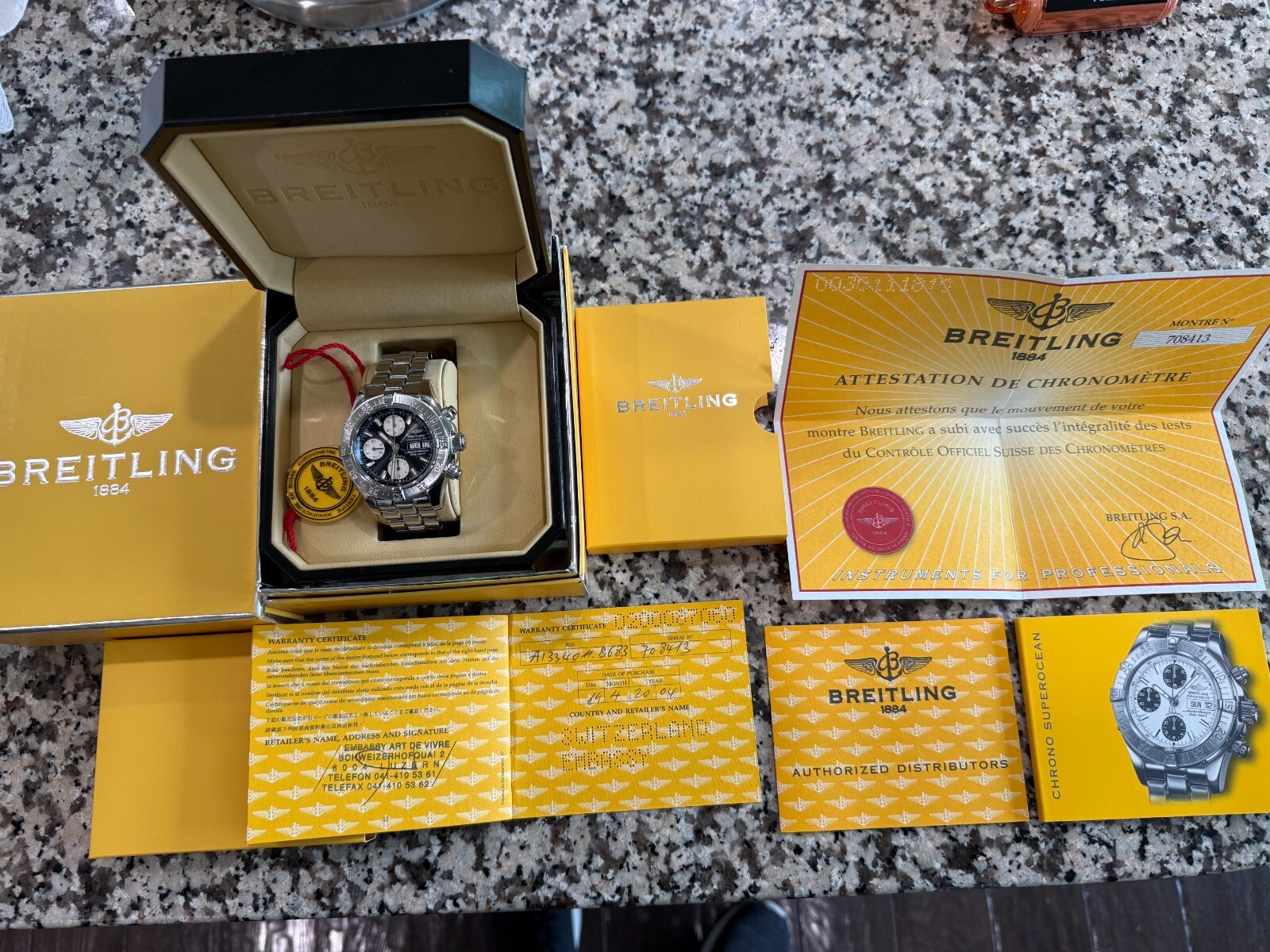 📍Breitling Superocean Chronograph A13340 – Full Set – 42mm Automatic COSC 💰 Asking: $3,150 OBO Selling my hardly used practically like new Breitling Superocean Chronograph (Ref. A13340) in excellent shape. Purchased new in Switzerland 2004, one owner. Comes with EVERYTHING: original Breitling box, COSC certificate, warranty card (dated 2004), manuals, hang tag, original receipt from Lucerne Switzerland and come with original stainless steel bracelet. Keeps perfect time. ⸻ ✅ Automatic movement (Caliber 13 – COSC certified) ✅ 42mm stainless steel case ✅ Black dial with silver subdials – Day/Date ✅ Water resistant to 500m / 1650ft ✅ Sapphire crystal ✅ Unidirectional bezel with rider tabs ✅ Full matching paperwork and serial number ⸻ 📦 Comes with: • Original boxes (inner & outer) • Warranty booklet • COSC certificate • Instruction manuals • Hang tag • Extra links ⸻ 📍 Located in Colmar, PA 🚗 Local pickup or can meet in a safe public location 💬 Message me if interested or want more pictures/video Shipping available at buyer's cost. Accept cash, PayPal or Zelle. Might be open to trades.