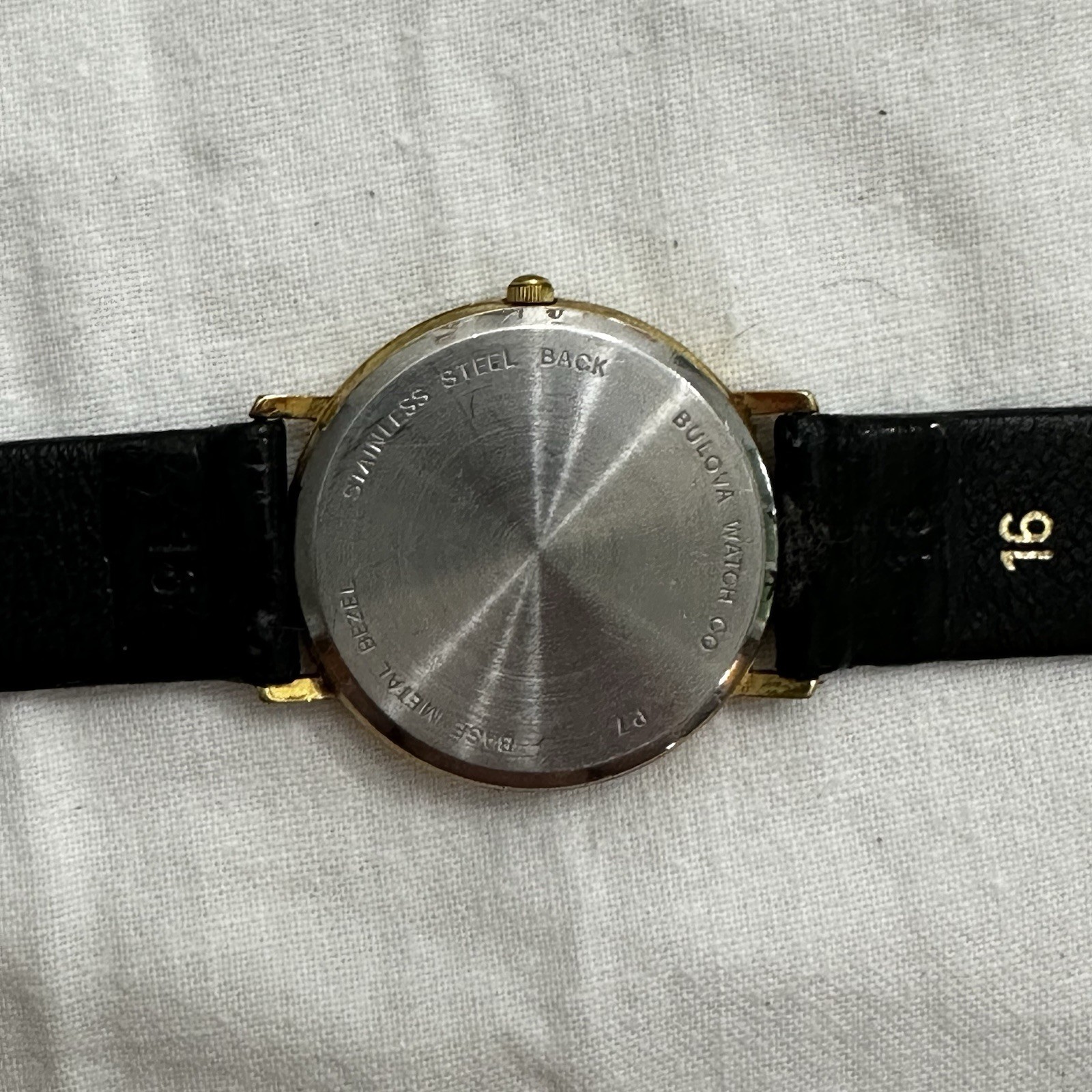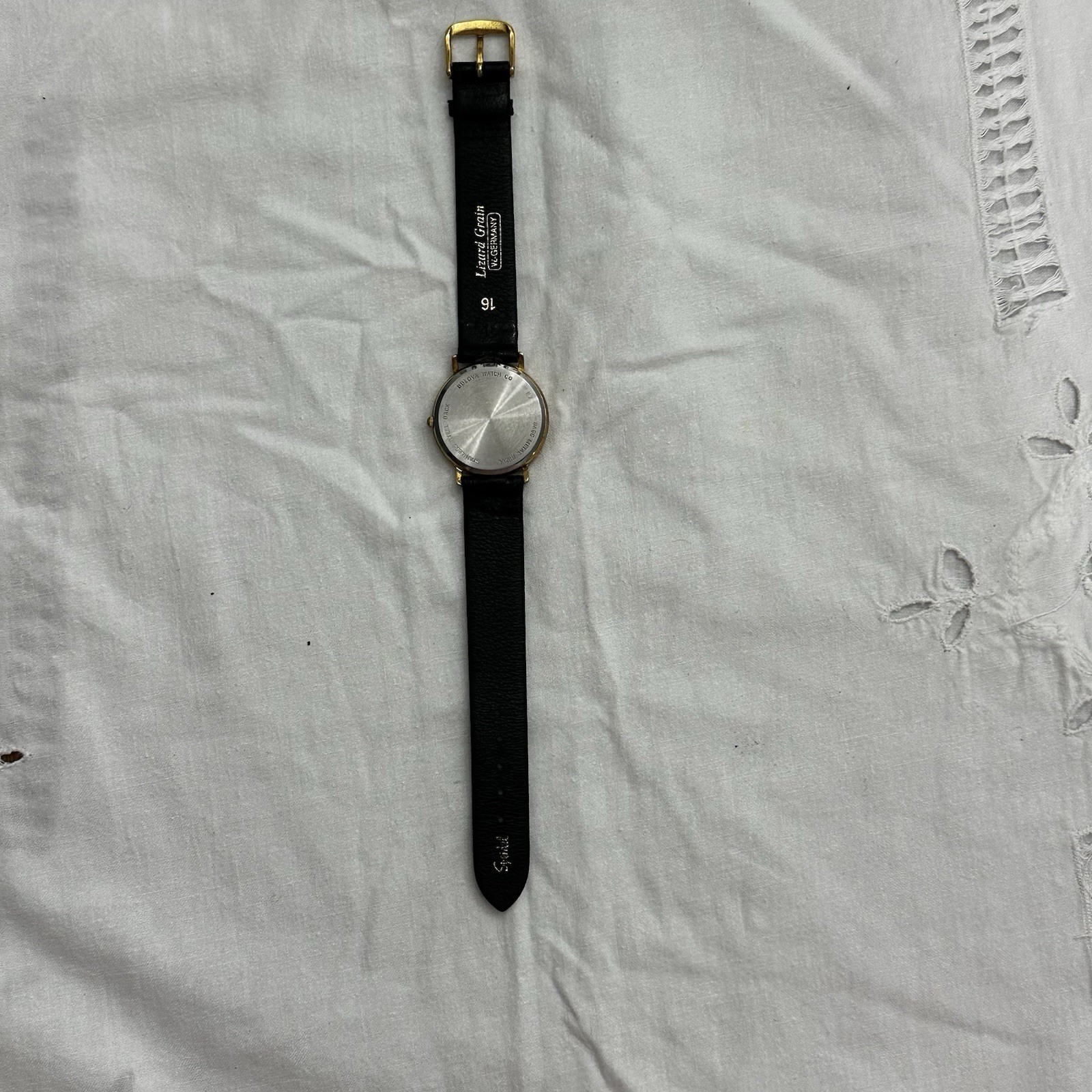 The Bulova VTG Women's Quartz Wristwatch with a 16 Speidel Lizard Grain Strap is a classic timepiece with a round gold dial and black genuine lizard strap. This vintage Bulova watch features stick indexes, a quartz movement, and water-resistant mineral crystal. With a polished case finish and 12-hour dial, this elegant wristwatch is perfect for women looking for a timeless accessory that combines style and functionality. It does not come with papers, original box, or manual, but it does have a two-piece strap for a comfortable and secure fit. Please see pictures for condition and any imperfections.