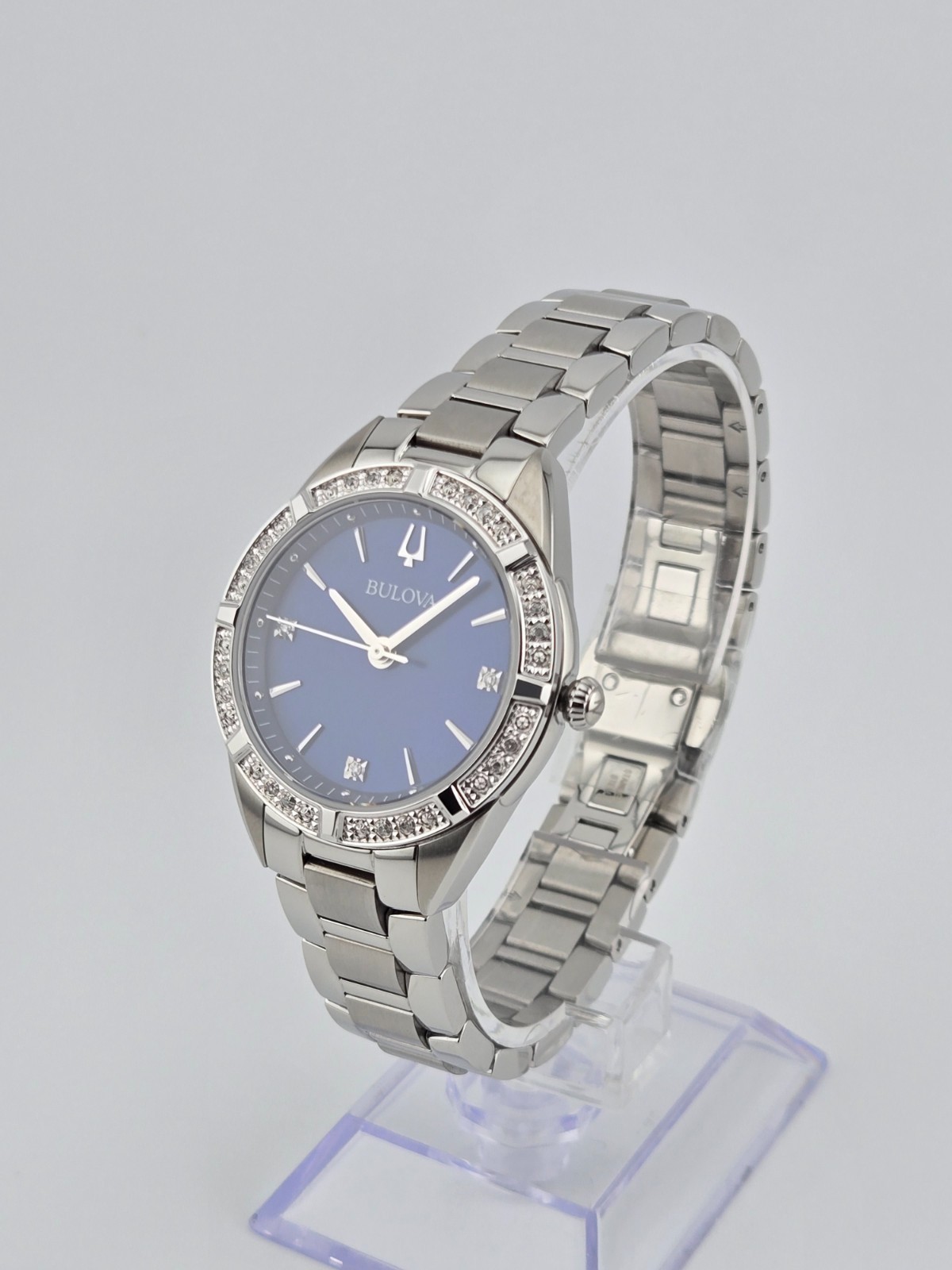 Bulova Women’s Sutton Diamond Bezel Silver Tone Ladies Watch 96R243 ($425 MSRP) With Gift Box and Tags! This watch is a Shelf Pull from one of the Major Department Stores. Watch has micro scratches on the watch case/band, visible under direct light. The Bulova Women’s Sutton Diamond Blue Dial Tone Ladies Watch (model 96R243) is a testament to Bulova's dedication to combining elegance with precision engineering. This luxurious timepiece is part of Bulova's esteemed Sutton collection, renowned for its classic yet contemporary designs. The 32mm stainless steel case is perfectly sized for a feminine wrist, providing a sleek and sophisticated look. The stainless steel bracelet, with its silvery steel hue, complements the case, adding a touch of refinement to this exquisite watch. The stunning blue dial of the 96R243 is adorned with diamond hour markers, creating a captivating sparkle that enhances the watch's overall elegance. The use of diamonds as hour markers adds a touch of luxury and sophistication, making it suitable for both everyday wear and special occasions. Protected by a durable mineral crystal, the dial is resistant to scratches, ensuring that it maintains its clarity and beauty over time. The reliable quartz movement inside guarantees precise timekeeping, a hallmark of Bulova’s commitment to excellence in watchmaking. Bulova's rich history of innovation and craftsmanship, spanning over 143 years, is embodied in the design of this watch. The Bulova Women’s Sutton Diamond Blue Dial Tone Ladies Watch is not only a beautiful accessory but also a functional timepiece, with water resistance up to 30 meters, making it practical for everyday use. This watch is ideal for the modern woman who values both style and precision, offering a perfect blend of timeless elegance and contemporary flair. Whether worn to the office, a casual outing, or a formal event, this watch is sure to make a statement. Features Brand: Bulova Collection: Sutton Model Number: 96R243 Gender: Women's Dial Color: Blue Watch Bracelet material: Stainless Steel Case Material: Stainless Steel Case size: 32mm Bracelet Colour: Silvery/Steel Movement: Quartz Water Resistance: 30m Fast and Free Shipping You're already purchasing the item. Why pay additional for shipping, especially slow shipping? We get your order shipped out within 1-business day and delivered to your doorstep as quickly as possible. Competitive Pricing With our dynamic pricing model, our prices are always competitive. Our prices are some of the lowest that you will find on the internet. Rest assured that you're getting a good deal when purchasing with us. 30-day Money Back Guarantee We are committed to making sure that you leave this transaction satisfied. If you're unhappy with the product for any reason, you may return it back for your money-back or a replacement within 30 days. No questions asked!