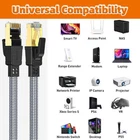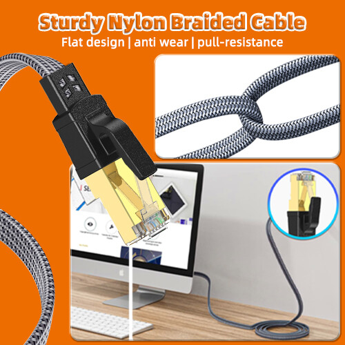 CAT8 New Generation Network Cable The cat8 ethernet cable performance is nearly four times better than cat7. The most important transmission rate up to 40Gbps, bandwidth up to 2000Mhz, and holding RoHS, CE, UL certification for quality assurance .The packaging method is mainly environmentally friendly packaging.Over 8 meters, there're free installation nails. Nylon Braided Protection Double braided nylon exterior make cat8 ethernet cable more durable, flexible and tangle-free. And this sturdy cat 8 patch cord can be bended at least 10 thousands times, so that you can reuse it without any concerns. Nylon is less susceptible to moisture storage and easier to air dry than cotton. Structural Design The ethernet cable cat8 is made of 100% copper raw materials. The higher transmission efficiency is the reason why copper cat 8 patch cord is more popular than general aluminum ethernet cable. The twisted pair is wrapped in PE and uses separte pair shielding on the outer layer for stronger resistance to shielding interference. Flat design, easy to bend. Gold-plated RJ45 Contact Patch Cord cat 8 uses the standard RJ45 connector of the network cable. The upgraded interface not only uses gold-plating at the rj45 connection, but also uses gold-plating on the outer layer of the interface that may affect the link, reducing the problem of signal interference at the network connection. Widespread Use Scenario Cat 8 Computer Cables are widely compatible with Cat5, Cat5e, Cat6, and Cat6A Ethernet cables. Provides universal connectivity for Televisions, Xbox One, Xbox 360, Switches, Routers Modems, PS3, PS4, Computer, Laptop, Printers, Network Printers, Network Attached Storage Device and other networking equipment. Fluke Test Each cat 8 network cable is sent after professional Fluke test to ensure the quality of goods.Each network cable is made of environmentally safe materials, without the addition of any polluting chemical pollution materials.