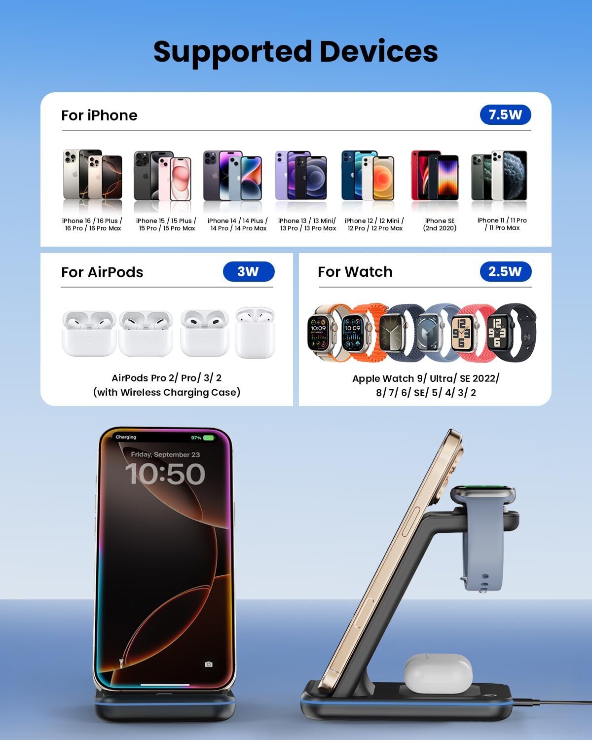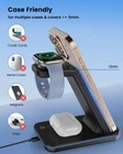 Features: Compatible with all wireless supported devices, including: Phone: -Apple: iPhone 16/15/14/13/13 Pro/13Pro MAX, iPhone 12/12 Pro/12Pro MAX/11/11pro/8, iPhone 8 Plus; iPhone Xs Max, Xs, XR, X, -Samsung Galaxy S21,S20, Note10,S10 S6, Edge, Galaxy S7, Edge, Galaxy S8, Galaxy S8+, Galaxy Note 5,Galaxy Note 8, Galaxy S9 , Galaxy S9+; -Google: Pixel 3, Pixel 3 XL; -LG: V40, V30, V30+; -All wireless-enabled devices. Earbuds: Airpods 3/2/Pro; Galaxy Earbuds. Watch: Apple Watch 7/6/SE/5/4/3/2 (Only for Apple Watch. Not for Samsung Watch.) Time for fully charging 3 devices simultaneously: 2~3.5 hours for fully charging phone 4~5.5 hours for fully charging Airpods 2/pro, Galaxy Earbuds 5~6.5 hours for apple watch. Specifications: -Color: black -Input: DC5V / 2A, DC9V / 1.67A -Output: 5W / 7.5W / 10W - Efficiency:≥80%( QC 3.0 Adapter Required, included) Safety Certificate: -Certified by CE, FCC & RoHS, Package include: 1*CIYOYO Wireless Charger dock 1* 18W QC 3.0 adaptor 1*User manual 1* Type C Charging Cable Note: 1. Our wireless charger stand can only support apple watch(Not for samsung watch or other brands watch) 2. Abnormal product noise like current sound, please stop use immediately. Multi Charger Station for Clutter-Free: CIYOYO 3 in 1 wireless charging station keeps your phone, watch and earbuds charged simultaneously while making your desktop or nightstand neater. Built-in with watch charger, CIYOYO true wireless saves the hassle of inserting Apple Watch charging cable into the charging dock. It works flawlessly with iPhone 16/15/14/13/12/11/X/8 series, Apple Watch 8/7/6/5/4/3/2/SE【Not for Watch OS11 Beta】, Airpods 3/2/Pro, and other wireless-enabled devices. Fast Charging & Heat Dissipation: No overheating, No damage! Unlock safety fast charging with this phone and watch charger stand as it's equipped with a certified QC 3.0 18W fast adapter and designed with many heat dissipation holes on the back, cooling down your phone and keeping the charging speed at its maximum and ensuring stable and fast charging which is 30% faster than other wireless chargers. More Considerate Design: ① Designed with dual charging coils, CIYOYO wireless charger provides vertical and horizontal charging for a comfortable viewing angle to watch videos, and FaceTime while charging. ② Anti-slip silicone on the base avoids moving or flipping, and each charging area coated with antistatic silicone prevents sliding and scratching. ③ The Sleep-Friendly LED indicators turn off within 20s automatically, and will not disturb your sleep even for overnight charging on your bedside Case Friendly: No need to remove the case every time you charge your phone! CIYOYO wireless charger is capable of charging directly through protective cases with thickness up to 0.2in. (Note: 1. Please remove magnetic and metal attachments or credit cards before charge to ensure the charging stability. 2. Does Not work with the Otterbox Commuter case). Universal Compatibility: 10W Max Fast Charging for Samsung Galaxy S22+/S22/21/ S20/S10/S10 Plus, etc. 7.5W Max Fast Charging for iPhone 16/15/14/14 Plus/14 Pro/14 Pro Max/13 Pro Max/13Pro/13/12 Pro Max/12 Pro/12/11/ 11 pro/11 Pro Max/XS XS Max/XR/X/8/8 Plus【Not for iPhone 12 Mini/13 Mini】.5W Max Standard Charging for Apple Airpods 3/2/Pro. 3W Max Standard Charging for Apple Watch 8/SE 2/7/6/SE/5/4/3/2【Not for Watch OS11 Beta】. (Please upgrade your watch to WatchOS 8.6) 100% Safe & Reliable: Your most reliable charger is here! The CIYOYO wireless charging station is built with multiple safety protection like over-current protection, over-voltage protection, over-temperature protection, short-circuit protection, overcharge protection and more to fully protect your devices. We provide 24 months warranty, any problems, you can get instant service from us.