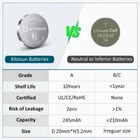 Superior Quality: Produced According to International Battery Standards. Each Unit Test before Pack. All Brand New A Grade Batteries Guaranteed. CE and RoHS Certified. Big or small, We cover it all Long-Lasting Batteries Designed for Dependability: 10 Years Storage Shelf Life. 245mAh Capacity is 10% more than standard CR2032. Lithium coin batteries deliver the long-lasting power and performance you can count on for electronic devices throughout the home or on-the-go. You can be confident these batteries will be ready when you need them Child-Secure Packing makes Lithium Coin battery packaging nearly impossible to open without scissors. Great for storage safety. Zero Risk of Leakage, Short Circuit or Rust. 5pcs CR2032 Batteries Sealed in Each Card. You never make a mess. Reliable Power : The 2032 3V Lithium batteries power both daily and essential home devices, Primarily used for car key fobs, remote controls, Apple AirTag, glucose monitors, thermometers, Watches, Computer motherboards, Calculators, Meters, Air Tag, Electronic organizers, Garage door openers, Games, MP3 players, Digital voice recorders, Door chimes, Pet dog collars, Battery LED Tea Lights Candles, Blood Sugar Test Machine, Sporting Stuffs, Pedometers, Calorie counters, Stopwatches, Glucometers, Medical devices and many more. Compatibility: works in devices using 2032, BR2032, CR2032BP, DJ2032, DL2032, EA2032C, ECR2032, E-CR2032, KCR2032, LM2032, 5004LC, 5004LB, L14, SB-T15, EA-2032C, L2032, KL2032, KECR2032, GPCR2032, KT-CR2032,Energizer CR2032, E- CR2032 Pack of 10pcs CR2032 LIthium Batteries, 2 Cards Great Battery Replacements for submersible Floralyte Lights, Apple Airtag, car key fobs, keyless entry key fob