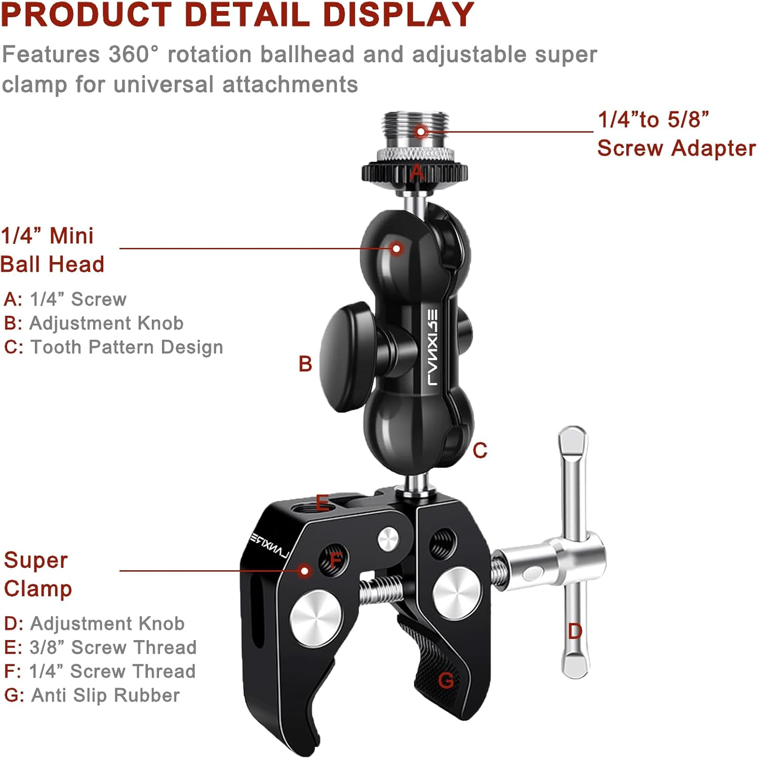 Store New Arrivals Add to Favorite View Feedback Contact Microphone Holder Camera Clamp with Double Ball Head Magic Arm and 5/8" Microphone Screw for Microphones - Max Load 4.4Lb / 2Kg - 5 X 1/4" and 3/8" Threaded Holes Description Item model number L0135 Item dimensions L x W x H 3.54 x 0.98 x 5.51 inches Color Black Material Type Aluminum alloy, Stainless steel, Nickel-plated brass and Silicone Product Dimensions 3.54 x 0.98 x 5.51 inches Material Aluminum alloy, Stainless steel, Nickel-plated brass and Silicone Country of Origin China Item Weight 7.84 ounces Color Name Black -The mic mount is made of high quality aluminum alloy, nickel-plated brass and stainless steel, solid and sturdy. It is great replacement for the cheap plastic adapter. It is very easy to tighten and loosen for installation and removal. It is very easy to carry anytime anywhere. -This silver 1/4 female to 5/8 male thread screw adapter is anti-rust and anti-corrosion, made with nickel-plated brass for durability. Use it for microphone mounts and stands. -The adjustable mini magic arm can be 360° rotated and 180° tilted, which make it easy to find the best angle for your needs. It is also compatible with most microphones, shock mounts and microphone clips. -This mic stand clamp will serve you well in recording, podcasting, live streaming, video recording, Skype, YouTube and more. It features a one-handed operation, making it easy to clamp or release your device. -The Mic mount is compatible with various devices, including condenser microphones,dynamic microphones and more. It is a versatile and reliable solution for professionals, streamers, and content creators. Product Description ABOUT US We offer the best prices around on high quality products. Our E-store includes media such as books, movies, music and games while offering electronics, toys, sporting apparel, clothing, tools, general home, garden items and more. SHIPPING We are always working hard to ensure your package arrives as soon as possible. Please understand that some factors like weather, high postal traffic, and the performance of shipping companies are outside of our control. We offer free shipping to the lower 48 states and ship within 2 business days of payment, usually sooner. We do not accept P.O. Boxes. Please provide a physical address. RETURNS We offer a 30-Day Return Policy on items which you are not completely satisfied with. You have the option for a full-refund or an exchange of the item. No returns are available on items shipped outside of the USA. PAYMENT We accept PayPal. CONTACT US This page content is yet to come Please ad us to your favorite seller and visit again later Thank You CUSTOMER SATISFACTION We try our very best to make sure every customer is completely satisfied. If there's a problem, message us! We're happy to help.