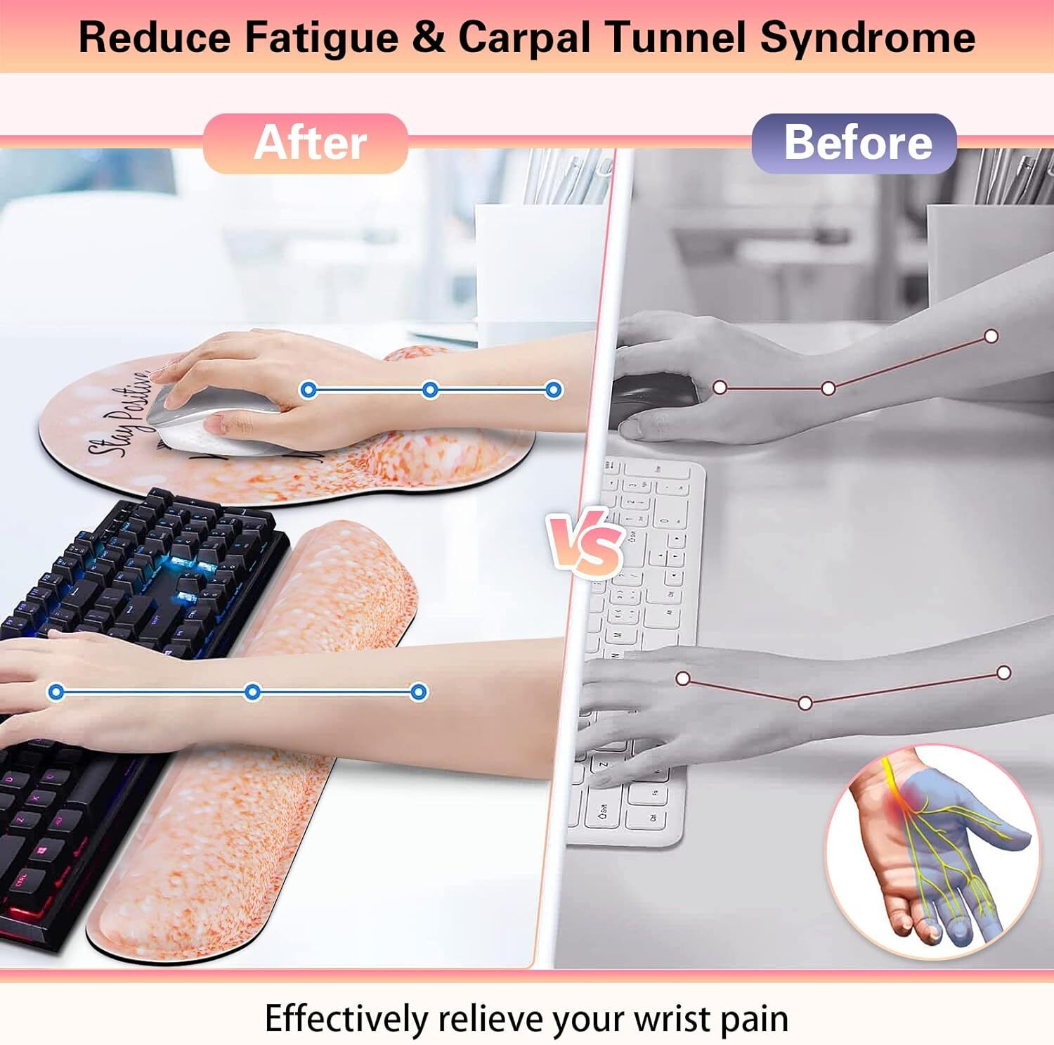 Mouse Pad Wrist Support Set, Canjoy 3-in-1 Large, Champagne-stay Positive Product Details Style: Gaming Special Feature: Ergonomic Keyboard Description: Ergonomic Cover Material: Lycra Compatible Devices: Mouse, Keyboard Fill Material: Memory Foam Form Factor: Ergonomic Shape: Round Manufacturer: Canjoy Item Weight: 9.6 ounces Package Dimensions: 16.89 x 5.51 x 2.24 inches Material Type: Spandex, Memory Foam, Rubber Manufacturer Part Number: Canjoy Size: Large Material: Spandex, Memory Foam, Rubber Color: Champagne-stay Positive Brand: Canjoy Product Dimensions: 16.9"L x 3.54"W ❤【3-in-1 Ergonomic Mouse Mat】Equipped with keyboard wrist rest(16.9x3.54inch)+mouse pad (9.9x9inch),+coaster(4.75x4.75inch). Canjoy keyboard wrist rest is very comfortable for long-time typing and prevents you from getting carpel tunnel. The mouse pad with wrist support will also be a good companion on your desk, especially while you are gaming or working. ❤【Exquisite Appearance】 Using advanced printing technology, Canjoy mouse pad with wrist rest has clear patterns, bright colors, exquisite patterns bring a sense of relaxation when your the body and mind are exhausted. Whether these desk mat with wrist rest set is for study, office, game, decoration or as a ideal gift, it is very suitable for you. ❤【Ergonomic Design】 Designed curve shape helps you keep the wrist in the straight line, avoid joint and wrist problems, and release pressure on the elbow and shoulder. This ergonomic mouse pad provides good support and comfort for your wrist, keep your wrist in a natural relaxed tate, thereby effectively preventing and improving the carpal tunnel syndrome. ❤【Memory Foam and Superfine Fabric】 Memory foam inside the keyboard and mouse wrist rest pad keeps your wrists lifted and supported in a comfortable way. It has a low rebound and will return to the original shape after removing your wrist. Covered by the superfine Lycra fabric, this wrist rests for keyboard and mouse is easy to be cleaned by wet rag or washed, no deformation and durable than other ones. Enorgnomic mouse pad has a soft and smooth surface, chase your mouse fast and accurately. ❤【Value Pack】You will get a keyboard wrist rest+ mouse pad+ cute coaster. The bottom base of the mouse and keyboard pad is made of good natural gel, which is no harm to human heath. It will not have unpleasant smell compared with other mouse wrist rest pads.