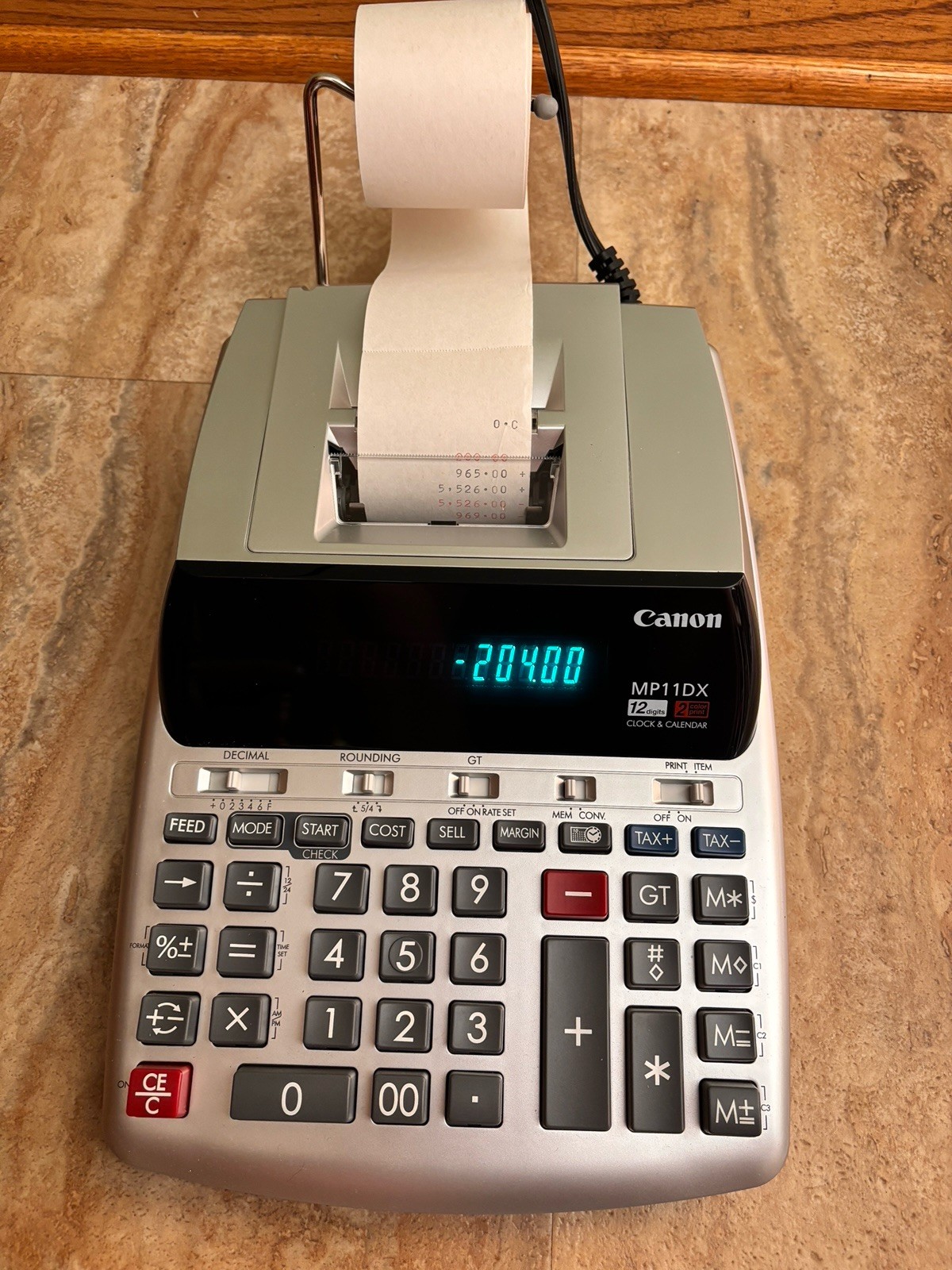 The CANON 2-color Adding Machine MP11DX-2 Printing Calculator is a large desktop calculator with a 12-digit display, perfect for businesses and office use. It features a power cord and battery power source, along with useful functions like a calendar and clock. Made by Canon in China, this printing calculator comes with its original box and paper, making it a convenient and reliable tool for various office tasks.