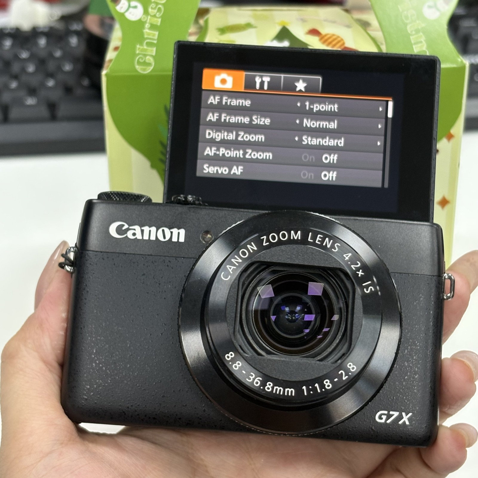 Canon PowerShot G7 X Black 20.2MP Compact Digital Camera English Product Information: New 1.0-inch, 20.2 MP High-Sensitivity CMOS Sensor combined with Canon's powerful DIGIC 6 Image Processor f/1.8(W)-f/2.8(T), 4.2x optical Zoom (24mm-100mm), 9-blade iris diaphragm and IS equipped lens Selfie-ready multi-angle capacitive 3.0" touch panel LCD Capture stunning 1080p/60p Full HD video with up to 60 fps IMPORTANT NOTE: Please refer to the Product Descriptiion section for troubleshooting information. Built-in Wi-Fi and NFC Compatible Mountings Canon RF, Canon EF Aspect Ratio Unknown Photo Sensor Technology CMOS Supported File Format JPEG (EXIF v2.3), Raw (Canon CR2, 12-bit) Image Stabilization Optical Maximum Focal Length 100 Millimeters Optical Zoom 4.2 x Maximum Aperture 1.8 f Expanded ISO Minimum 125 Metering Description Multi, Center-weighted, Spot Package contains: Camera*1 Memory card*1 Battery*1 Charger*1
