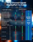 Capshi 8K 4K DisplayPort Cable 1.4, 6.6FT DP Cord (VESA Certified, 8K@60Hz, 4K@144Hz, 2K@240Hz/165Hz), 32.4Gbps High Speed Display Port Cable for Gaming Monitor, HDR/FreeSync/G-Sync, Braided, Grey Product Details Size: 6.6 Feet Style: 8K-1 Pack Color: Grey Brand: Capshi MPN: Capshi-6601 UPC: 738628999368 EAN: 0738628999368 Brand: Capshi Connector Type: DisplayPort Cable Type: Display Port Compatible Devices: Gaming Monitor, Desktop, Laptop, UHD TV, for AMD Graphics Card, for NVIDIA Graphics Card Special Feature: Braided, DP 1.4, High Speed Brand: Capshi Connector Type: DisplayPort Cable Type: Display Port Compatible Devices: Gaming Monitor, Desktop, Laptop, UHD TV, for AMD Graphics Card, for NVIDIA Graphics Card Special Feature: Braided, DP 1.4, High Speed Recommended Uses For Product: Displayport to Displayport 1.4 Color: Grey Connector Gender: Male-to-Male Data Transfer Rate: 32.4 Gigabits Per Second Shape: Round Number of Pins: 10 Frequency: 240 Hz AC Adapter Current: 3 Amps Unit Count: 6.6 Feet Gauge: 28.0 Specification Met: Vesa Indoor/Outdoor Usage: Indoor Number of Items: 1 Outer Material: Nylon Manufacturer: Capshi UPC: 738628999368 Package Dimensions: 7.2 x 7.17 x 0.79 inches Item Weight: 4.2 ounces Item model number: Capshi-6601 Date First Available: July 15, 2020 8K DisplayPort Cable 1.4: This VESA Certified Displayport 1.4 Cable supports 8K@60Hz, 5K@60Hz, 4K@144Hz/120Hz, 2K@240Hz/165Hz and HDCP 2.2/1.4. Display port 1.4 cable is more flexible and slimmer than 28AWG tinned copper, can directly be connected from DisplayPort equipped desktop/laptop to monitor Multi-functional Support: The 8K DisplayPort cable supports video resolutions up to 8K@60Hz and transmits HD audio and video from computer to display, ideal for video streaming and gaming. It is also backward compatible with DP 1.3/1.2/1.1 Advanced Technology: The cable delivers enhanced bandwidth via HBR3 (32.4 Gbps), featuring multiple shielding layers and 24K gold-plated connectors. Supports Display Stream Compression 1.2 (DSC), FEC error correction, 32-channel audio, plug & play functionality, and Mirror/Extended Modes Ultimate Gaming Experience: High refresh rates of 4K@144Hz and 2K@165Hz enable crystal-clear enemy tracking with zero frame drops. Dynamic HDR optimizes dark scenes and enhances visual details, delivering tactical advantages in FPS games and immersion in AAA masterpieces Universal Compatibility: The DisplayPort cable is compatible with all graphics cards and monitors with DisplayPort ports; It supports DP, DP++, and DisplayPort++; Avoid using extensions or adapters, as signal conversion may reduce performance