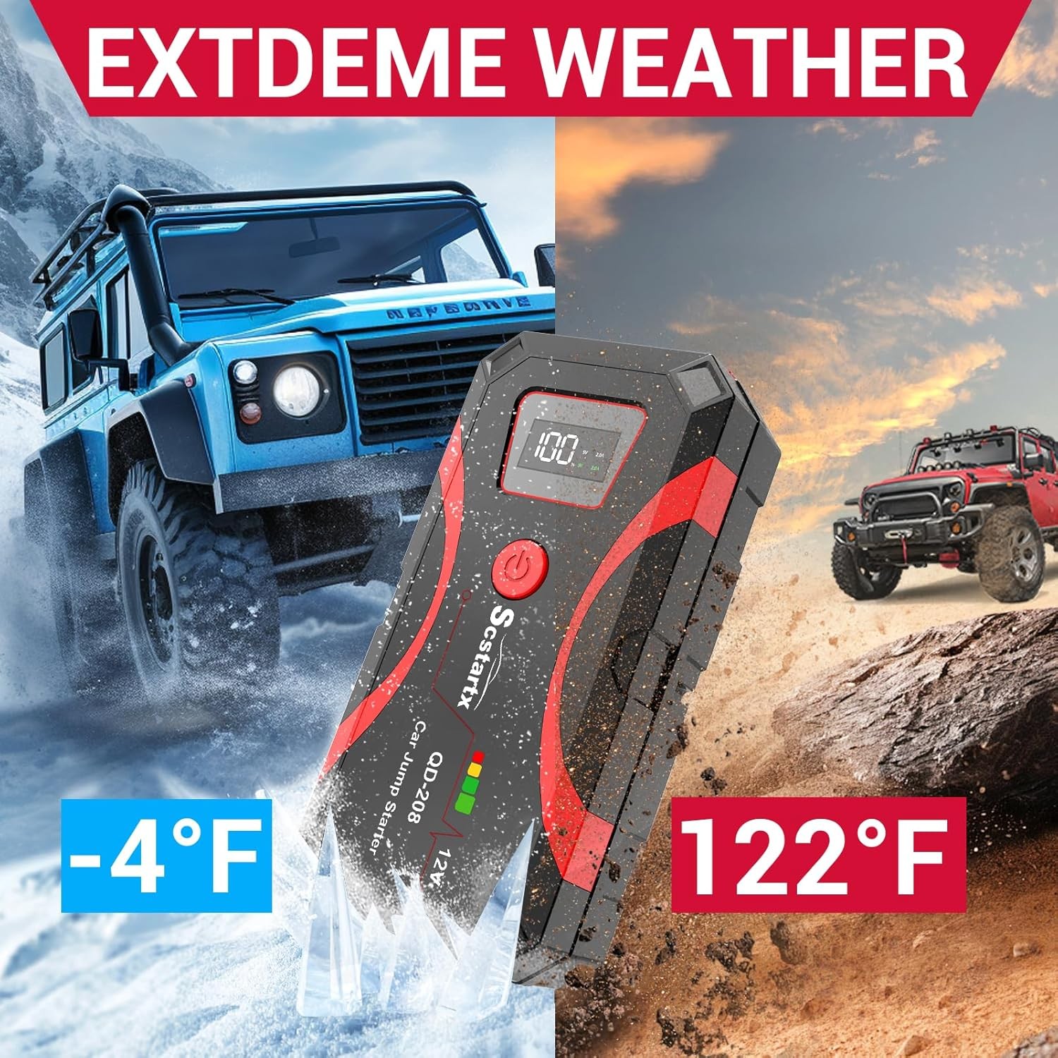 208 Car Battery Jump Starter, Portable Power Battery Pack 2000A Peak 12V Jump Box for Motorcycle Up to 7L Gas & 4L Diesel 3 Modes Flashlight and Safety Jumper Clamps About this item 【Powerful Car Jump Start】With 2000A Peak Current And Reinforced Smart Clamps,Battery Booster Can Reliably Start All 12v Dead Batteries Easily And Safely In 1-3 Seconds. Jump Start cars, trucks, motorcycles, boats, yachts, lawnmowers, ATVs, SUVs, snowmobiles, pickups, And More Even In Extreme Temperatures -20℃~60℃. 【Portable Charger and LED Flashlight 】The Car Jump Start Built-In Led Flashlight,The built-in 3-mode LED light helps you in the dark or in emergencies. jump starter power bank with 2 USB Outputs, Charge Phones, Tablets, And Other Usb Devices On-The-Go. 【Guarding Your Safety】Swiftly Jump-Start Your Vehicle. Smart Chip With 10 Integrated Safety Protection Technologies, Alongside Automatic Connection Detection And Real-Time Visible Alerts, This Portable Car Battery Charger Jump Starter Guarantees 100% Safety And Eliminates Any Risk Of Sparking.