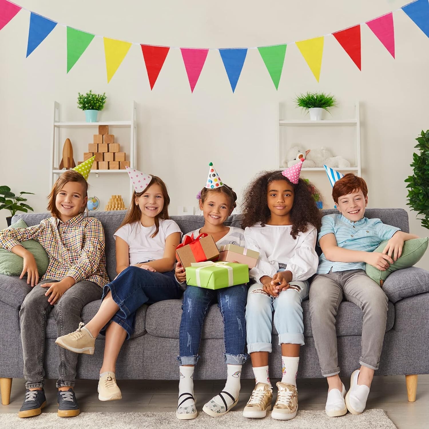 About this item Nylon Quality Selection: These flag strings are made of thick nylon rope, all pennant banner flags are laser cut and quality stitched on the white string to make it can be reused time and time again. Package Included: Total 300 pieces colorful party flags contains 5 vibrant colors, includes red, blue, green, and yellow, super easy to add an attractive and exciting addition to any party. Product Size: Single-sided pennant banners-7" x 11" (w x l), the total length of the banner-375ft.The length is enough, if large event or outdoor space is too large, it is recommended to buy more at a time to create a warm atmosphere. Wide Use: These colorful banner flags are very suitable for outdoor events or indoor decor-weddings, birthday, dance party, rainbow theme party, grand openings, carnivals, circus decorations; Christmas, sports events, school graduation ceremony and other holiday celebrations. Note: These pennants need to be connected in series by themselves. The work is convenient and simple.