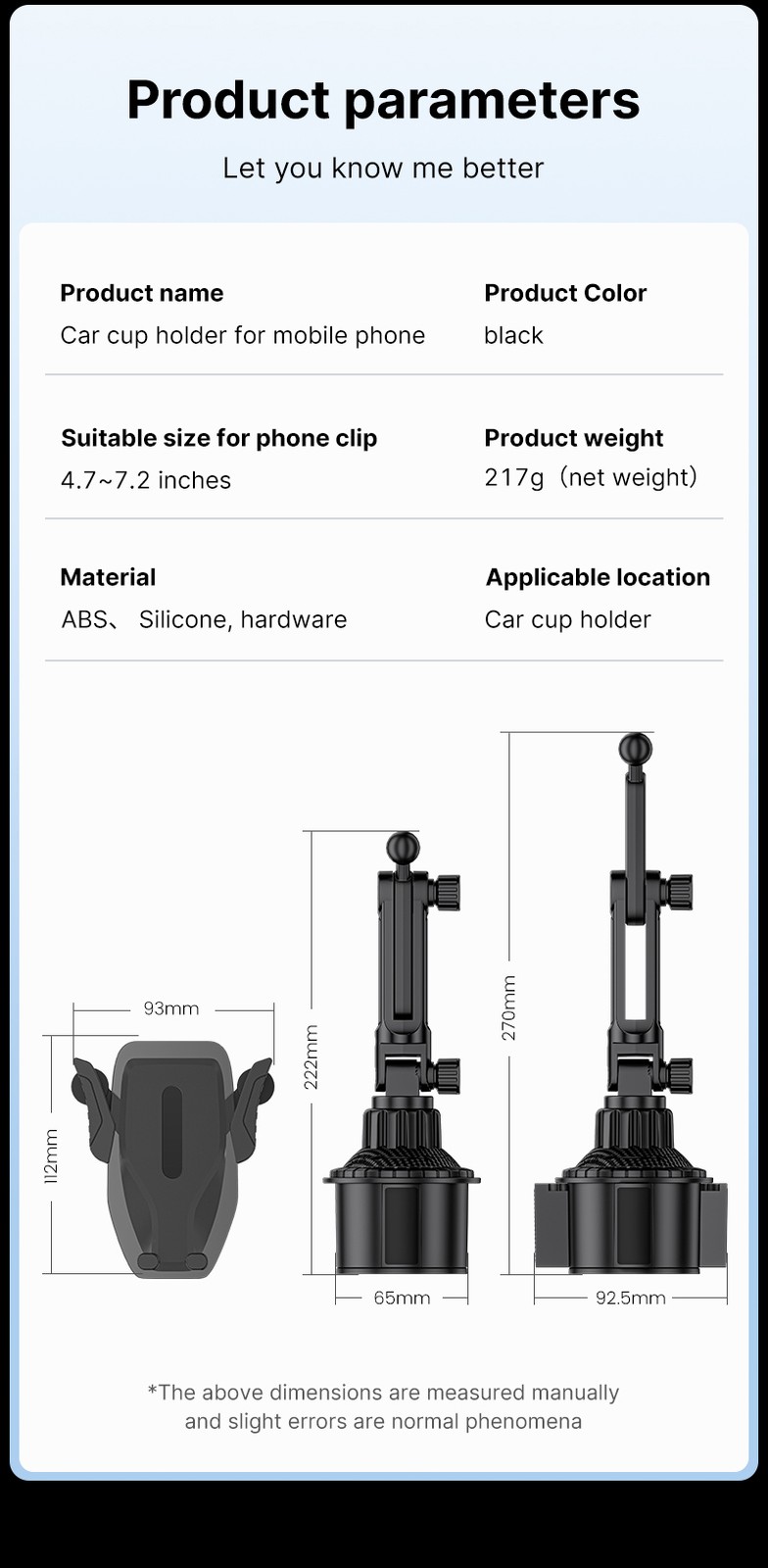 Product Description Car Phone Mount 360° Universal Cell Phone Holder Stand For iPhone Car Cup Holder Features: 1. Car cup hole telescopic phone holder stand: Stable support 360° Rotatable 2. Stable cup holder design & Easy installation: Innovative water cup hole fixing structure, suitable for water cup grooves of most vehicle models, no need for pasting or drilling, easy to install, stable without shaking. 3. Double-joint telescopic rod with Adjustable height: The extendable extended support arm can be freely adjusted in height and Angle to meet the needs of different sightlines, making navigation clearer and driving safer. 4. Universal compatibility & Compatible with multiple mobile phones: Telescopic clamping arm, suitable for 4.7-7.2 inch mobile phones, compatible with mainstream models such as iPhone 16/15/14 series, Samsung, Xiaomi, Huawei, etc. 5. High-strength material & Stable and durable: Made of ABS+ carbon fiber texture material, it is durable and scratch-resistant. It is equipped with a reinforced base and a silicone anti-slip clamping arm, providing strong clamping without dropping. 6. 360° rotating with freely adjust the Angle: Supports landscape and portrait screen switching, multi-angle adjustment, easily adapting to various usage needs. Whether it's navigation, calls or music playback, you can always find the best perspective. 7. Easy to operate/Take and put with one hand: The one-click press release design enables you to place and remove the phone with one hand, making the operation more convenient during driving and enhancing driving safety. Widely Applicate: It is applicable to various vehicle models such as SUVs, sedans and MPVS It can be used in scenarios such as navigation, live streaming, and video calls Packaging list: 1x Car cup mobile phone stand About Us Payment Shipping Terms Returns Contact Us We will leave POSITVE FEEDBACK after receiving the payment. Please be sure to contact us if you are not satisfied with the item before leaving FeedBack. We are salling the best price products and best service! Office Time: Monday to Saturday 9:30~18:30 (UTC+8) We accept PayPal Only. All major credit cards are accepted through secure payment processor PayPal. Payment must be received within 7 business days of auction closing. We ship from USA, Fast shipping and best service for you! We will ship by USPS within 2 business days after payment is cleared by PayPal. We are not responsible for any custom duty or import tax. We will leave POSITVE FEEDBACK after receiving the payment. Please be sure to contact us if you are not satisfied with the item before leaving FeedBack. All the emails and messages will be answered within 1 business day. if you do not receive our reply, please kindly resend your email or message and we will reply to you as soon as possible. Serious Buyer Only! Please place bid only if you agree with all the terms. We accept return within 30 days since buyer receiving the item. Please write us eBay message for our return information, pleaes don't file RETURN case before contact us. Item must be returned in original package at good condition. Please contact us via eBay message. We will respond your message within 24 hours on business days. About Us We will leave POSITVE FEEDBACK after receiving the payment. Please be sure to contact us if you are not satisfied with the item before leaving FeedBack. We are salling the best price products and best service! Office Time: Monday to Saturday 9:30~18:30 (UTC+8) Payment We accept PayPal Only. All major credit cards are accepted through secure payment processor PayPal. Payment must be received within 7 business days of auction closing. Shipping We ship from USA, Fast shipping and best service for you! We will ship by USPS within 2 business days after payment is cleared by PayPal. Terms We are not responsible for any custom duty or import tax. We will leave POSITVE FEEDBACK after receiving the payment. Please be sure to contact us if you are not satisfied with the item before leaving FeedBack. All the emails and messages will be answered within 1 business day. if you do not receive our reply, please kindly resend your email or message and we will reply to you as soon as possible. Serious Buyer Only! Please place bid only if you agree with all the terms. Returns We accept return within 30 days since buyer receiving the item. Please write us eBay message for our return information, pleaes don't file RETURN case before contact us. Item must be returned in original package at good condition. Contact Us Please contact us via eBay message. We will respond your message within 24 hours on business days. You may also like Car Windshield Mount Cradle Holder Stand GPS for Cell Phone Universal 360° 7.82 USD Free shipping 520 pc Spade Butt Ring Electrical Connector Splice 22-10 Gauge Wire Terminal Kit 15.7 USD Free shipping 360° Mount Holder Car Air Vent Stand For Mobile Cell Phone GPS iPhone Samsung 6.95 USD Free shipping 360° Magnetic Car Air Vent Phone Mount Cradle Holder Stand For Cell Phone iPhone 6.9 USD Free shipping Car Wireless Bluetooth FM Transmitter MP3 Player 2 USB Car Charger Adapter Kit 7.99 USD Free shipping Universal Adjustable Car Mount Gooseneck Cup Holder Cradle for Cell Phone iPhone 8.79 USD Free shipping Heavy Boxing Punching Bag Training Gloves Speed Set Kicking MMA Workout Kick Bag 23.61 USD Free shipping Anti-Aging Laser Plasma Pen Mole Removal Dark Spot Skin Tag Tattoo Wart Remover 17.9 USD Free shipping High Pressure 4000PSI Car Power Washer Gun Spray Wand Lance Nozzle Hose Kit M22 19.77 USD Free shipping 47" Tactical Rifle Bag Gun Range Padded Soft Carbine Backpack Carry Case 28.92 USD Free shipping 8inch 2500W Wireless Portable FM Bluetooth Speaker Heavy Bass Sound System Party 36.79 USD Free shipping 6 7 8 9 18 21 24 27 Speed Bike Chain Stretch-Proof Links For Campy SRAM Shimano 12.65 USD Free shipping Car Mount Car Cup Holder Phone Stand For 4.7-12.9" iPhone iPad Tablet Universal 12.75 USD Free