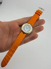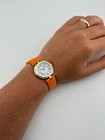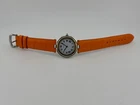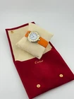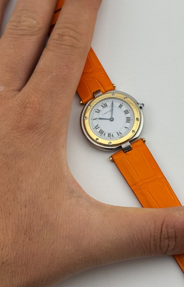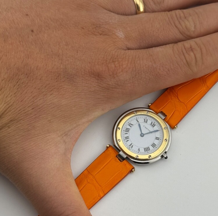 PROPONIAMO; -Marca: CARTIER SANTOS RONDEE -Cassa:ACCIAIO E ORO DA 32,5MM ESCLUSA CORONA , FONDELLO ORIGINALE SERRATO CON 8 VITI -Movimento :ORIGINALE CARTIER CALIBRO 81 COEVO IN TUTTE LE SUE PARTI -Vetro:ZAFFIRO -Corona:ORIGINALE CON CABOCHON -Ghiera: ORO GIALLO SOLIDA -Tasti: NO -Quadrante:BIANCO SPIDER ORIGINALE -Lancette: ORIGINALI ACCIAIO AZZURRATE -Cinturino/Bracciale: PELLE GENEICO ARANCIONE DA 18MM , FIBBIA CARTIER 16 MM -Scatola e documenti: NOSTRA POCHETTE IN VELLUTO COMPRESA + BOX ORIGINALE -Condizioni : OTTIME -Revisionato:SI -Uomo/donna/unisex:UNISEX PER QUALSIASI DUBBIO CONTATTATEMI ,RISPONDEREMO IL PRIMA POSSIBILE