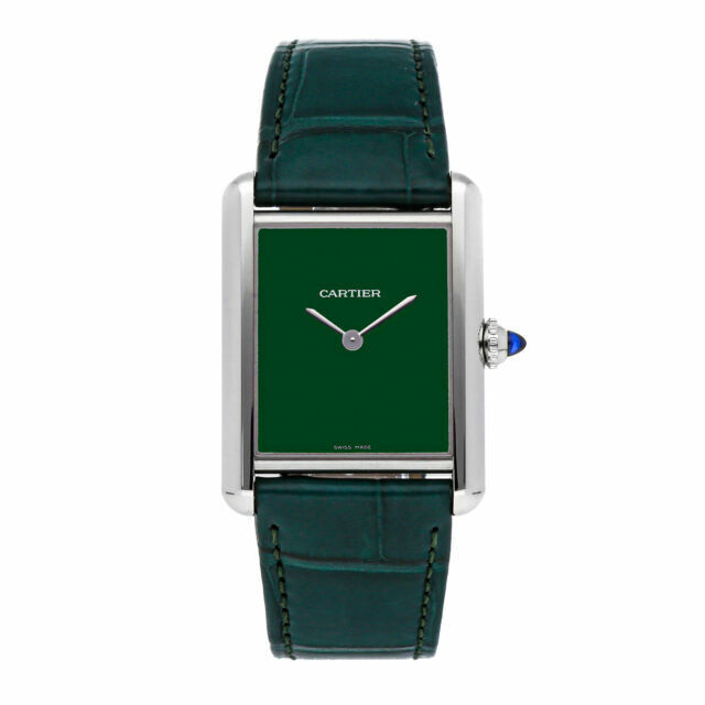 The Cartier Tank Stainless Steel Green Dial 25mm Quartz Men's Watch WSTA0056 is a luxurious and elegant timepiece designed for men. Featuring a stainless steel case with a silver bezel and green dial, this watch exudes sophistication and style. Boasting a quartz movement and water resistance up to 30 meters, it combines functionality with a touch of luxury. The two-piece strap in green adds a unique and sophisticated touch to this classy timepiece from Cartier. Ideal for those looking for a watch that can be worn for both formal and casual occasions.