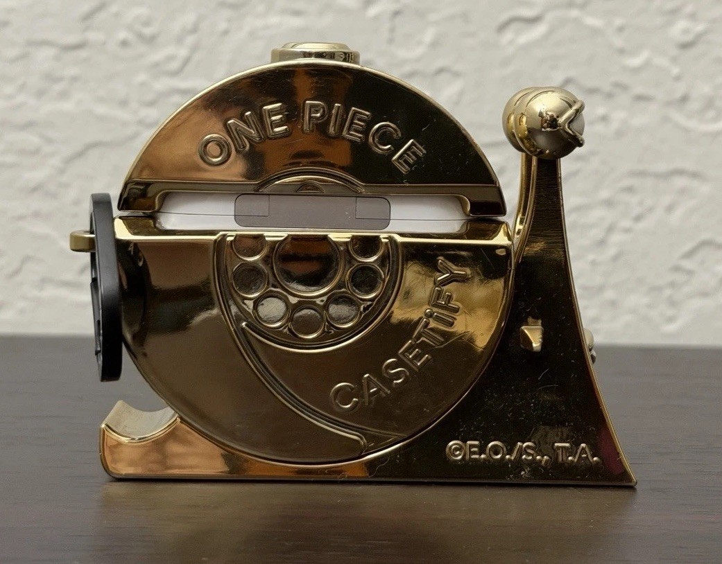Has some scratches and wear The Casetify One Piece Golden Transponder Snail AirPods Pro Case is a stylish and protective case designed specifically for Apple AirPods Pro. Featuring a unique Golden Transponder Snail character from the popular One Piece franchise, this case offers 360 protection for your device. Made with mixed materials, this case adds a touch of personality to your AirPods while keeping them safe from everyday wear and tear. Its gold color adds a touch of elegance to the design, making it a standout accessory for any fan of the series.