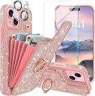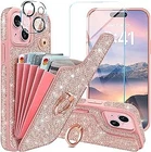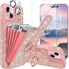 Casewind for iPhone 15 Case Wallet|with [Screen Protector + Camera Lens Protector] Glitter Sparkle 5 Card Holder 360°Rotation Ring Kickstand Cute Flip Shockproof Phone Case for iPhone 15|Rose Gold