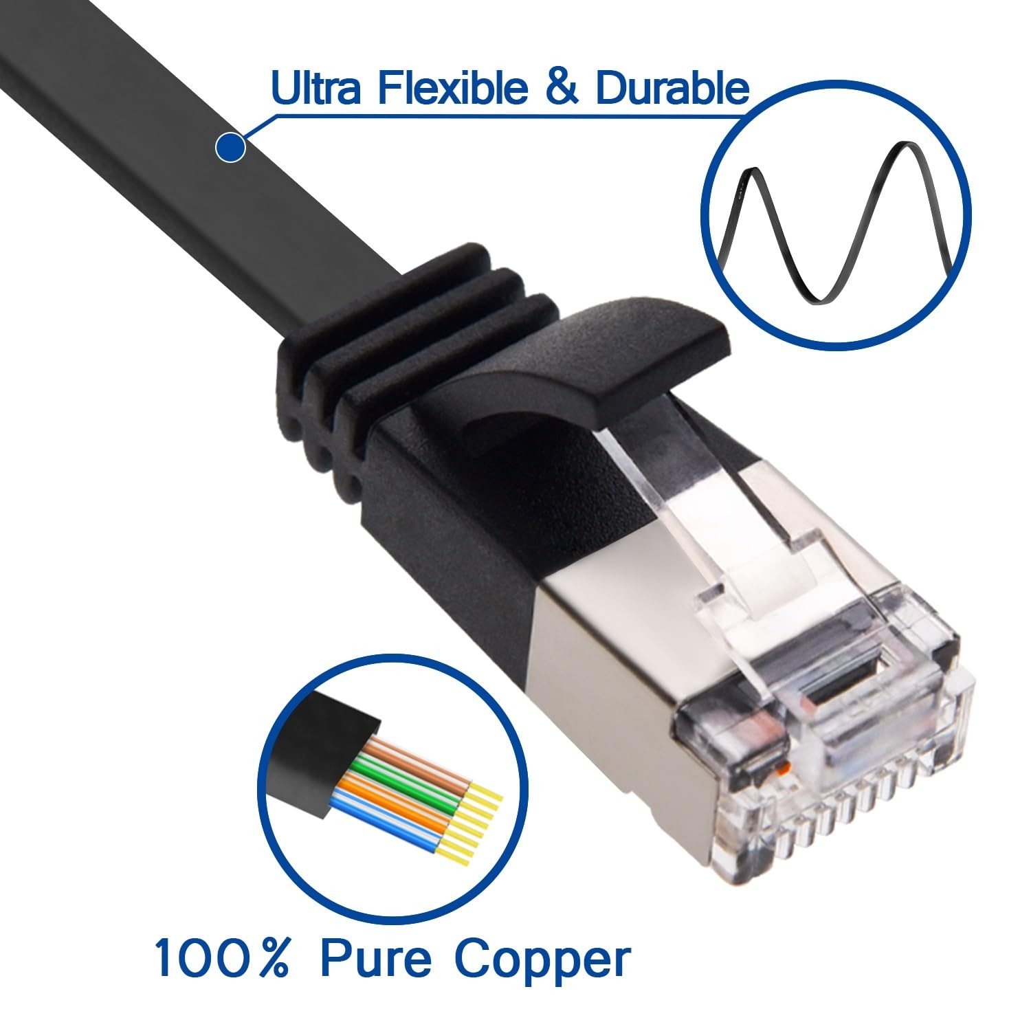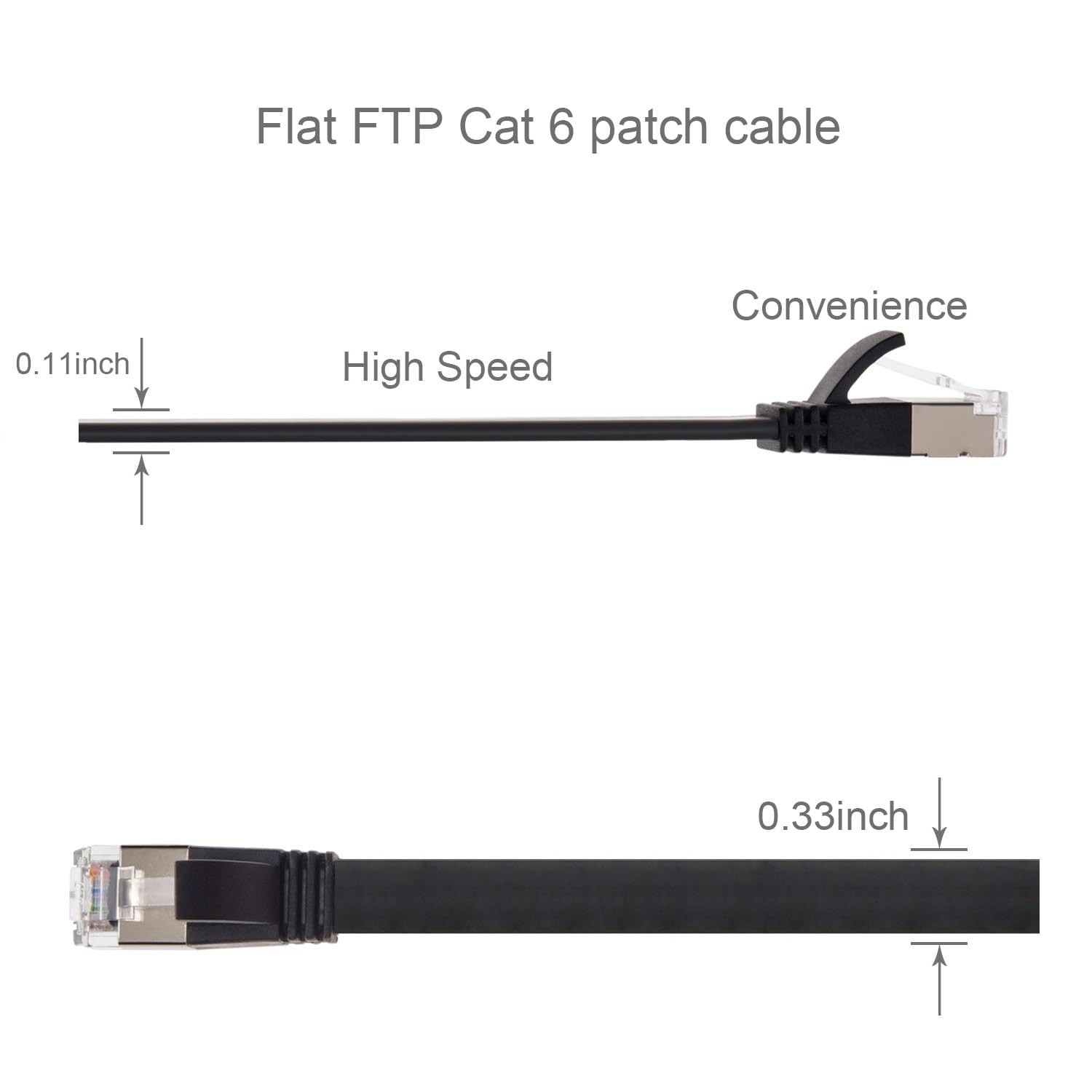 Cat.6 U/FTP Flat Ethernet Cables fit easily between cramped spaces, improving the look of your home or office due to their slim and easy-to-hide design. These flat cables fit perfectly under carpets, up walls, and even behind furniture and network equipment. The cables are a slim 0.11 inch (2.8mm) thick which allows plenty of ventilation room for network rack wiring. These flat shielded patch cables are designed to protect critical data from EMI (Electromagnetic Interference), which is known to degrade or even interrupt connectivity. Features: Flat 4-pair Shielded Twisted Pair 30 AWG bare copper wire pairs cable. Future-proof your network for 10-Gigabit Ethernet. TIA/EIA-568-C.2 by UL, ETL and RoHS Compliant Cat.6 standards. RJ45 plug with 50-micron gold plated contacts and strain-relief boots. Fit perfectly under carpets, up walls, and even behind furniture and network equipment. A slim 0.11 inch (2.8mm) thick which allows plenty of ventilation room for network rack wiring. Protect critical data from EMI (Electromagnetic Interference). High Performance Internet Category 6 Flat patch cables provide universal connectivity for LAN network components such as PCs, computer servers, printers, routers, switch boxes, network media players, NAS, VoIP phones, PoE devices, network adapters, hubs, DSL/Cable Modems, Patch Panels, and other Computer Networking applications. These flat cables fit perfectly under carpets, up walls, and even behind furniture and network equipment. Our Category 6 cables are made of flat 4-pair shielded bare copper wire pairs cable with a PVC jacket and snag-less molded boot. Future-proof your network for 10-Gigabit Ethernet. Fit easily between cramped spaces, improving the look of your home or office due to their slim and easy-to-hide design. The cables are a slim 0.11 inch (2.8mm) thick which allows plenty of ventilation room for network rack wiring. These flat shielded patch cables are designed to protect critical data from EMI (Electromagnetic Interference), which is known to degrade or even interrupt connectivity. Shielded patch cable with RJ45 gold-plated Connectors and are made of 100% bare copper wire, ensure minimal noise and interference. Each meet or exceeds TIA/EIA-568-C.2 by UL, ETL and RoHS Compliant Cat.6 standards. The wiring is T568B standard. The connectors with RJ45 plug with 50-micron gold plated contacts and strain-relief boots provide durability and ensure a secure connection. The snag-less bubble design protects the locking tabs on the RJ45 connectors from being damaged or accidentally snapped off.