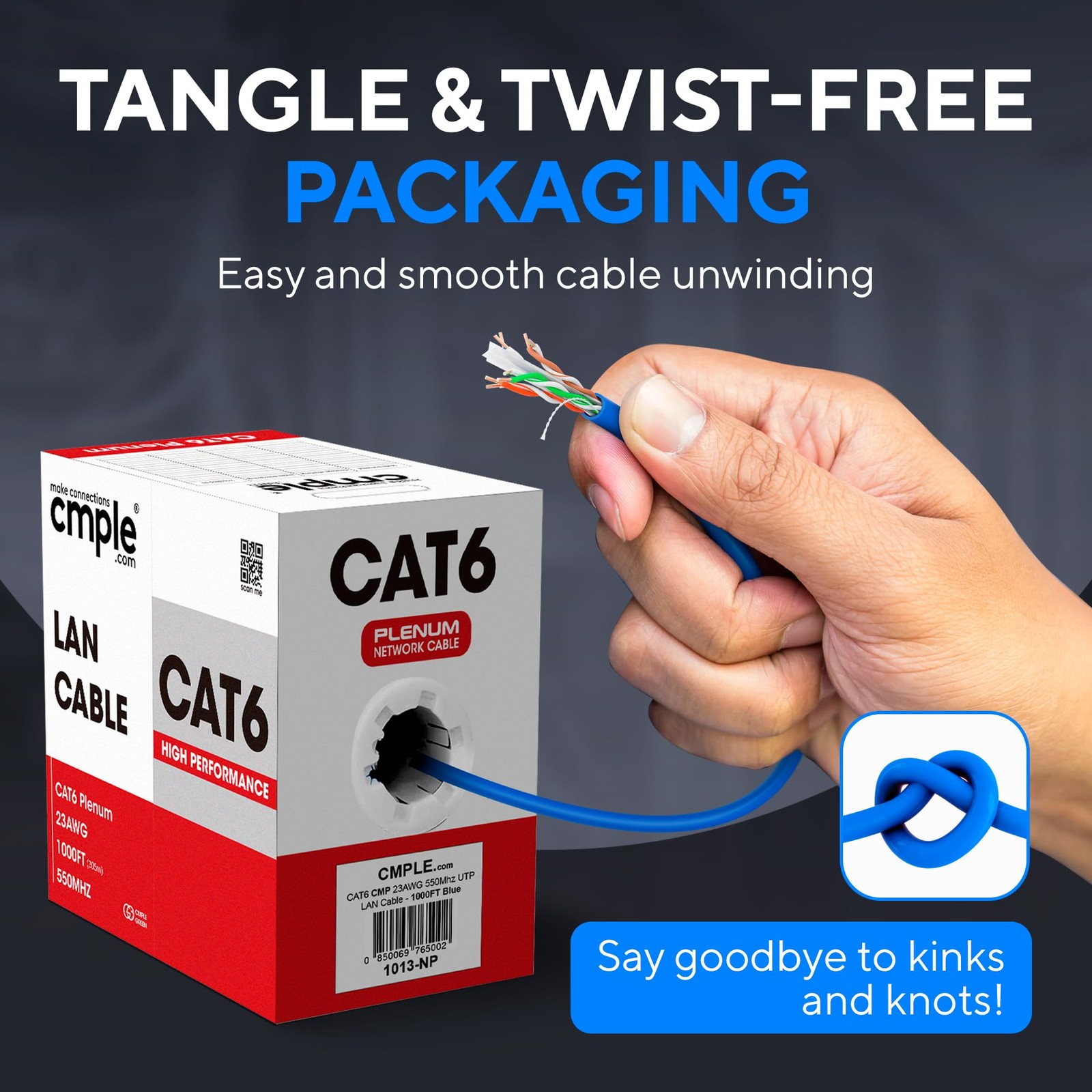 Upgrade your network with the Plenum Cat 6 Ethernet Cable, designed for high-speed, reliable performance in commercial and residential installations. This 1000ft bulk Ethernet cable is CMP-rated for plenum spaces, ensuring superior safety and compliance with fire codes. Made with 100% copper-clad aluminum, it features four twisted pairs designed to handle up to 550 MHz bandwidth, making it suitable for modern gigabit and faster Ethernet standards. Cat6's advanced structure minimizes interference from cross-talk, offering improved data integrity even in noisy environments. The 23 AWG cable is ETL-verified and CMP-rated, making it safe for use in indoor and plenum spaces such as ceilings, walls, and conduits. Its protective PVC jacket ensures durability while remaining flexible for easy handling in tight or complex setups. Additionally, the cable complies with UL standards, meeting the demands for communication installations. Key Features: High-Speed Performance – Supports up to 10Gbps speeds and 550MHz bandwidth, perfect for high-demand data transmission. CMP Plenum Rated – Meets strict fire safety standards for installation in plenum spaces, ensuring compliance and safety. Unshielded Twisted Pair (UTP) – Reduces crosstalk and interference for a stable and reliable connection. 1000ft Bulk Cable – Perfect for large-scale networking projects, including office buildings, schools, and data centers. This bulk Cat6 Ethernet cable is ideal for home, business, or professional installations, providing fast and secure connections for servers, routers, switches, security cameras, VoIP phones, and more. 1000ft Cat6 CMP-Rated Cable – Designed with a strong plenum-rated jacket for safe indoor use, this cable provides excellent durability and fire resistance. Its solid conductors help deliver reliable signal quality and long-lasting performance. 23 AWG Cat 6 Plenum Cable Unshielded Twisted Pair Construction - Crafted with copper-clad aluminum (CCA), provides reliable performance, supporting data transfer speeds up to 10 Gbps and a 550 MHz bandwidth Each 1000ft UTP Cat6 LAN Cable undergoes testing to guarantee high quality and customer satisfaction. It minimizes crosstalk for better signal integrity and complies with all standards Plenum Ethernet Cord with Convenient Pull-Box Packaging - The cable comes in a sturdy, easy-to-pull box for hassle-free installation. A tangle-free design and length markers along the entire 1000ft make measuring and running the cable straightforward Package Includes: 1000 Feet Cat6 Ethernet Cable is a CMP UTP Bulk Wire, 550 MHz - White
