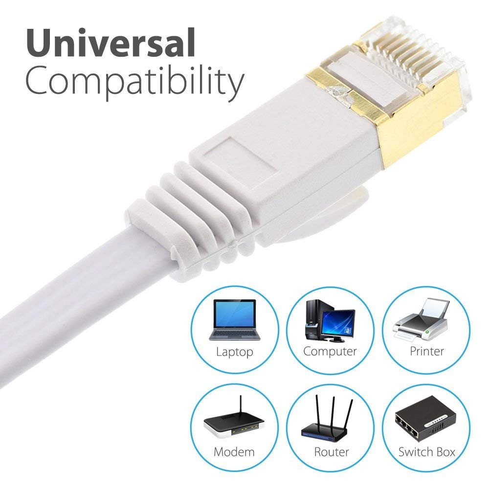 Feature: - Cable Type: CAT7 4-Pair FTP 100% Bare Copper - Connector: Gold Plated RJ45(8P8C) - Cable Performance: Up to 600MHz - Transmission Speed: 10000 Mbit (10Gigabit/s) - Connector Type: 8Pin 8Core Shielded Gold-Plated RJ45(8P8C) - Conductor Gauge: 32AWG - Size: Width 7.4mm x Thickness 2.4mm(approx.) - Insulation Material: High density polyethylene (HDPE) - Certification: ISO/IEC 11801; TIA/EIA-568-B.2-1; RoHS - Backwards Compatible with Cat6a, Cat6 ,Cat5e,Cat5,/b> Package included: - 1 X CAT7 Ethernet Cable - A Pack of Cable Clips Fast & Max Performance, Especially for Movie or Gaming The latest CAT 7 Ethernet Cable supports the bandwidth up to 600MHz, 10Gbps high speed data transmission, much faster than Cat 6a Ethernet cable. No more worry about jam, whatever you watch movie or play the game online, download or upload the big file. Flat & Slim(2.4mm thickness), Space Efficient & lightweight -flat network cable is flat and slim, so that the cable layout can be hidden under the carpet on the floor without raising it. Keep the floor smooth and brings about consistent electrical characteristics. -Light weight, roll it up compactly and easily carry when traveling. Interference Elimination - Each twisted pair STP of copper wires is shielded with Aluminum Mylar Foil, efficiently provides better protection from crosstalk, noise, and prevent from interference & transmission damping. RJ45 Connector with Gold Plated -The gold plated finishing conductors in each RJ45 connector ensure the contact is durable and stable. Warranty Limited 2 Years Warranty Note : Network Speed is determined by many factors,such as the cable,router, switch boxes, other network components, and also service provider. ,/b> ✔High Standards: The cable is compliant with ANSI/TIA/EIA 568-B, 2-1, with up to 10 Gbps data and meets all proposed CAT-7 Requirements; Supports:10GBASE-T; 1000 BASE-T; 100 BASE-T; 10 BASE-T. Supports 600MHz high-speed data transfer for server applications, cloud storage, video chatting, high definition video streaming, and gaming. Cat7 cables are the best generation. ✔High Compatibility:The Class F channel and Cat7 cable are compatible with cat5, cat5e, and cat6. Class F has less cross-talk and system noise past than Class E thanks to intelligent shielding.Perfect for networking switch, Laptop,routers, ADSL, adapters, hubs, modems, PS3, PS4, x-box, Patch panels and other high performance networking applications with RJ45 ports. ✔High Quality:Made of 4 shielded twisted pair (STP) of copper wires with two RJ45 connectors on each end; The Screened Shielded Twist Pairing (SSTP) design and connectors with 50 micron gold plated contact pins confidently protect the cable from external Electro-Magnetic Interference (EMI) for optimized signal quality. ✔High Neatness: The flat cable is designed to facilitate routing in a limited workspace. It can be easily hidden or run along any surface to improve the look of your home or office. Can be run under the carpet or bent through corners or into desks.Bundled with Cable Clips to hold.