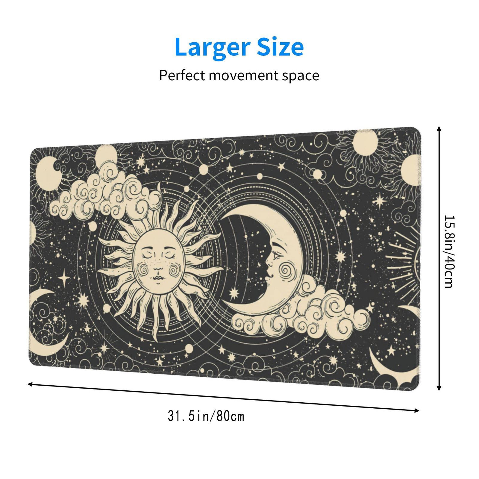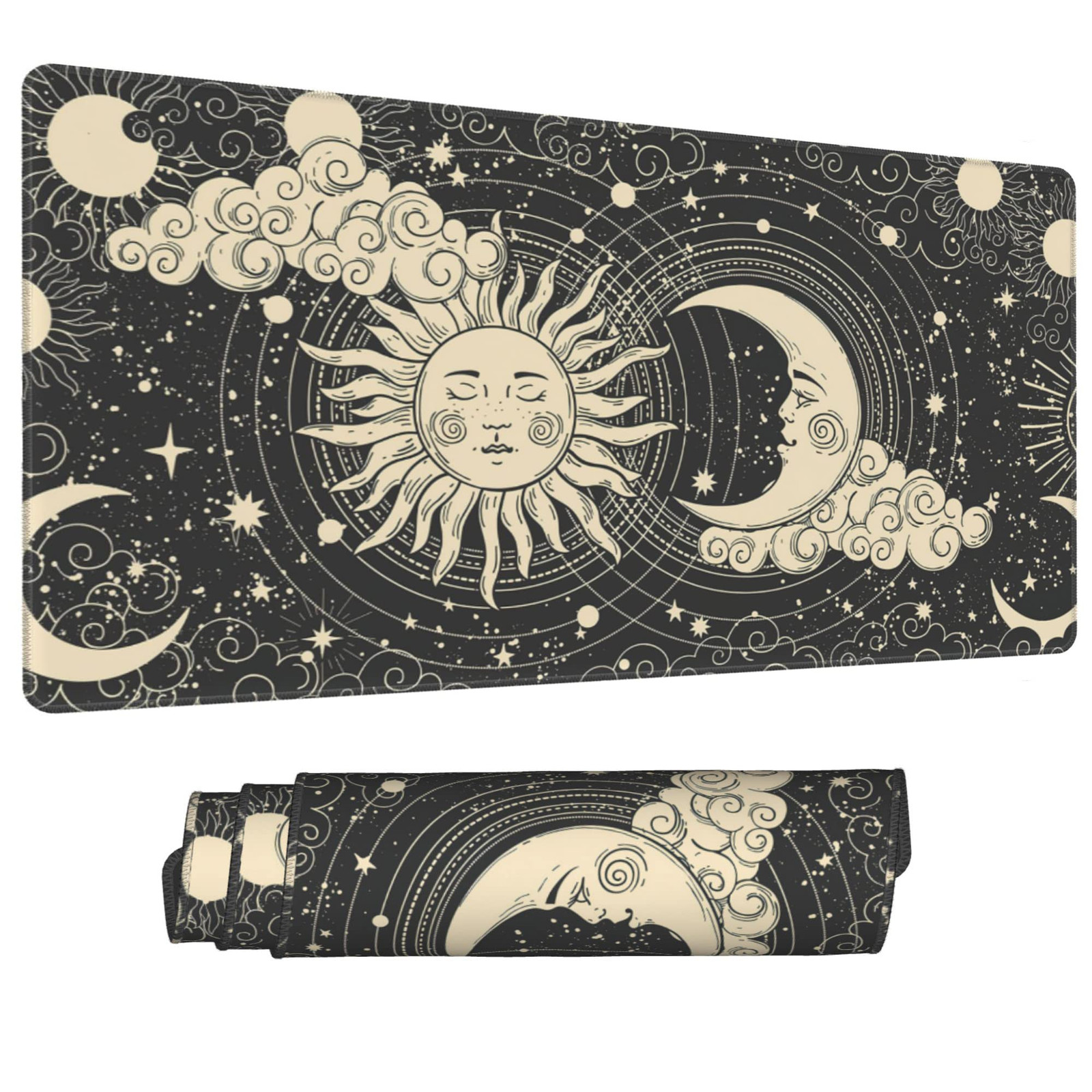 This desk mat is a game-changer for my workspace! The celestial sun and moon design is stunning and adds a cool vibe to my setup. It's huge—fits my keyboard, mouse, and laptop with room to spare. The anti-slip base keeps it firmly in place, and the smooth surface makes mouse movements effortless. The colors are vibrant and haven’t faded even after weeks of use. Perfect for gaming or office work, and it looks great in any room. Highly recommend for anyone wanting style and function!