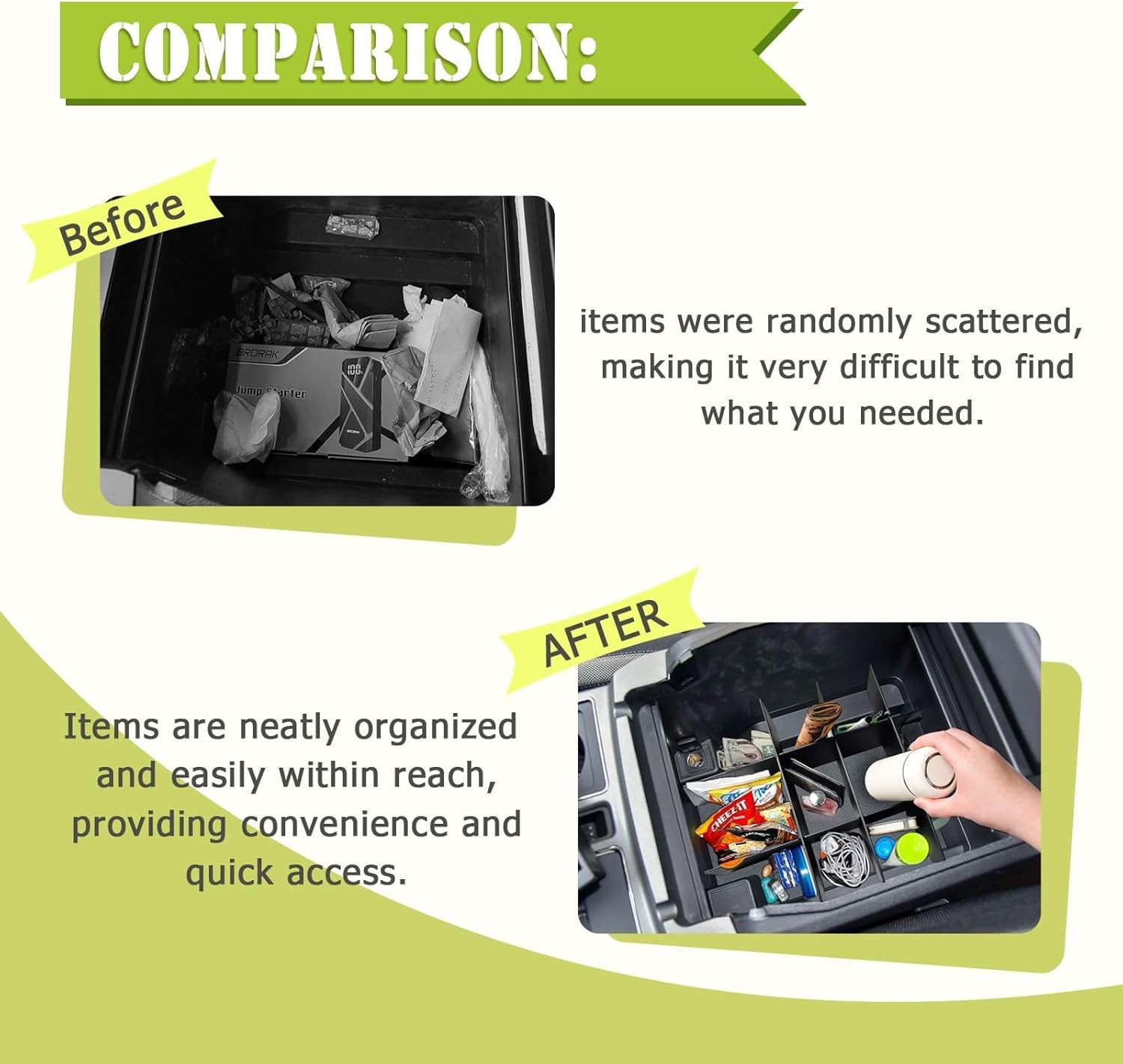 Suitable Model - Suitable for F250/F350/F450 SuperDuty (2017 2018 2019 2020 2021 2022) and Expedition (2018- 2023 2024) Note: Only fit full console w/bucket seats. Not for Split-Bench Seat! Well Organized - This divider trays break the space up into several compartments which greatly helps in keeping items organized. You can move the separators around to divide the compartments that would work for your stuff. No Rattle - This pieces match fit the inside shape of the center console tightly, and the grid drops into the console snugly, so it wont make rattle while driving. Will not affect your driving experience. Durability - Made from premium ABS materials, tough enough to use a long time, and not easy to deform under pressure. Easy to Inatall - Install directly, no need to modify. Just follow the arrows that are molded into the organizer slats.