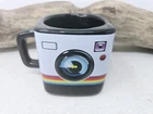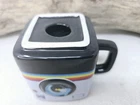 The ceramic coffee mug is designed in the shape of a square polaroid camera body with a glossy black finish. It features a rainbow pattern, adding a playful and colorful touch to the design. Perfect for photography enthusiasts or those who appreciate unique and eye-catching mugs for their collection or everyday use.