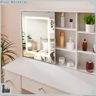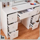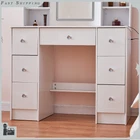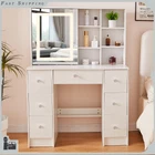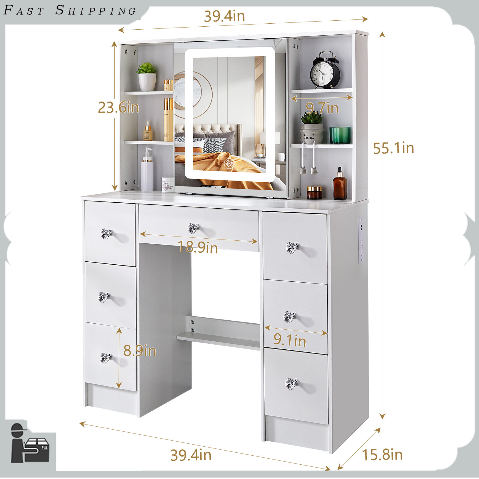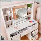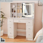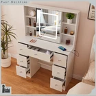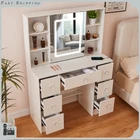 Charging Station Makeup Table Dressing Desk w/ LED Lighted Mirror & 7 Drawers Introduction: Chic makeup vanity features a spacious tabletop and 7 drawers with extensive room to store your cosmetics, jewelry and beauty essentials; While 6 side shelves provide enough platform to organize and display bottles of perfume and other accessories.Crafted of high quality wood in a brilliant finish, our vanity is strong and durable for long lasting usage. This vanity table features 7 drawers and 6 shelves to create coordinated organization in any room of the house. Feature plenty of storage to make up for the compact design. Powerful storage function makes it perfect fit for perfume, lipstick, necklace, etc. It can match your other furniture perfectly and adds fashion magic and charm to your room. Features: 【LED Lighted HD Mirror】This makeup table is equipped LED Light with adjustable brightness and has 3 lights modes: warm yellow, warm white and cold white light colors.It can accurately illuminate skin color and complexion during the day or at night, allowing you to enjoy every detail of makeup.The lightness will be adjustable if you long press the button. You can do your makeup in different angle or organize your cosmetic with a little push to the mirror. 【Powerful Storage Function】This vanity with lights and mirror desk and stool have 7 drawers and 6 shelves enough space for all makeups, jewelry, hair accessories, blow dryer.it means no more lost cosmetics. 【Durable and Elegant】Made of high quality MDF board in a white finish add a touch of glamour in your bedroom, dressing room or studio, and ensures durability and stability of the makeup vanity for years to come. USB & AC Outlet Power Station-- The makeup vanity set is constructed with a power station of 2 AC outlets and 2 USB ports , and a 4.9ft extension power cord. Very convenient to charge your hair dryer,phone, lamp and other electric appliances within arm's reach . Assembly Required: Yes Specification: Material: Manufacture Wood Color: White Package Weight: 87 lbs Shelf Quantity: 6Pcs Drawer Quantity: 7Pcs Overall Dimensions: 39.4 x 15.7 x 55.2 inch / 100 x 40 x 140 cm Mirror Dimensions: 17.7 x 23.6 inch / 45 x 60 cm Package include: 1x Dressing Table(without stool) 1x Instruction If you have any problem towards the order you received,please feel free to contct us,we promise will serve you and give you a satisfying solution.