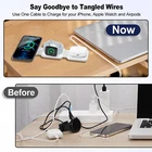 Apple Device Charging Companion, a must buy option - RTOPS 3 in 1 wireless charging station This wireless charger only supports Apple Watch, other smart watches are not recommended. The Apple Watch needs to be updated to the latest system when charging. When charging the device, avoid using thick protective cases (> 3 mm) and other accessories. To charge 3 devices at the same time or want a fast charging effect, you need an 18W fast charging adapter (included), or a higher wattage charging adapter. If you have AirPods 2 but can’t charge, please check if your AirPods 2 have wireless charging. Since there are two versions of AirPods 2 and 2nd Gen has no wireless charging function, our apple wireless charger can only charge AirPods 2 with wireless charging function. Make sure it does not connect the power supply when cleaning this iPhone wireless charger. Please don't charge in high temperature and humid environments to avoid damage of circuit. Mobile phone battery health has a certain relationship with charging speed. Please do not pull the wireless charging connection with force, the silicone is soft, and excessive force will easily damage the internal circuit. Strong compatibility, not only device but also various scenarios Compatibility of device IPhone 16/ iPhone 16 Pro/iPhone 16 Pro Max/ iPhone 16 Plus/IPhone 15/ iPhone 15 Pro/iPhone 15 Pro Max/ iPhone 15 Plus/iPhone 14/ iPhone 14 Pro/iPhone 14 Pro Max/ iPhone 14 Plus/ iPhone 13 mini/ iPhone 13/ iPhone 13 Pro/ iPhone 13 Pro Max/ iPhone 12 mini/ iPhone 12/ iPhone 12 Pro/ iPhone 12 Pro Max Apple Watch UItra 2/Ultra/10/9/8/7/6/ SE/ SE 2/ 5/ 4/ 3/ 2 (Series 1 not supported) AirPods 2/ AirPods Pro/ AirPods Pro 2/ AirPods 3/Airpods4 ( AirPods 2nd Gen not compatible) Note that other brands of devices are not compatible Compatibility of space Home: Bedroom, kitchen, living room, dining table... Office: Working desk, meeting room... Leisure place: Coffee shop, business trip... Other... lf you're failing to charge your device, please try out the following: 1. Check if the device is compatible, see above detail, or ask the supplier 2. Check whether the indicator turns on or not. 3. Check whether the adapter is 18W OR above. 4. Check if the back of your device have any metal, pop sockets, or credit cards. 5. Put the devices in the center of the charging surface (this lets the charging coil in your devices lineup with the one inside the wireless charger). 6. Devices protect cases should be no thicker than 3 mm for effective charging, or take off directly. 7.Please restart the phone and test with another USB Type-c cable or unplug the adapter and reinsert it. Unusual Charging Coil Upgraded coil can help increase charging efficiency by 35% , special magnetic isolation sheet, no fear of radiation . And wireless charging Pad is equipped with foreign object detection , short circuit protection, temperature control and more. Gentle Blue Led Light For the blue long light , at this time for the state of charge, take off the devices light turns off ; When the blue light flashes, indicating abnormal charging , please check whether there are foreign objects around . Exquisite and Advanced After being folded, only half the size of an iPhone, Say goodbye to those endless cables and chargers. The small portable fast charger for iPhone is the perfect apple accessories for men, women or girls.