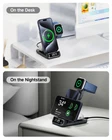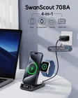 Upgraded Appearance Process - The SwanScout 708A features a phone charging panel crafted with UV transfer printing technology. The glossy charging panel, combined with a metallic-coated body, elevates the product's visual and tactile appeal Elegant Curved Display - Our charger features elegant curved corners, with the display continuing the curved design for enhanced aesthetic appeal. Its digital clock offers three brightness settings and the option to turn off completely for a personalized experience Perfect for Travel - When traveling, all you need is a SwanScout 708A, a charging cable (included), and a charging brick (not included) to charge three devices. When folded, the charger takes up minimal space in your suitcase Fast Charging - Equipped with an intelligent temperature control system, avoiding overheating and ensures optimal charging efficiency. Our tests show that it takes only 3.5 hours to fully charge for iPhone 15 Pro Max (0 to 100%), making it 28% faster than other chargers Broad Compatibility - The SwanScout 708A is compatible with iPhones, AirPods, and other wireless-charging-enabled phones and earbuds. The watch charging section is specifically designed for Apple Watch and is not suitable for other brands of watches Enjoyable Rotatable Watch Charger - The watch charger supports a 180° rotation. As you rotate it, you can feel the pause from the gear engagement and hear the accompanying mechanical sound. We hope this unique design adds an element of enjoyment to your usage experience