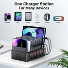 【150W Fast Charging】The multiple device charging station has 16 USB fast charging ports, each of which outputs up to 2.4A current for a total output of 150W. Charge your Android and iOS devices to 100% in an hour, keeping you productive throughout the day. 【Intelligent Charging】Our usb charging station for multiple devices has the function of automatically detecting and adjusting the output power, so that the electronic device is fully charged in the shortest time within the receiving current range. With a vertical stand, it can hold up to eight tablets or phones. Free up your power outlet by charging multiple USB devices at the same time. 【Safe charging】This usb charger station is made of fireproof material with multiple protection technologies to prevent over-voltage, over-current, overload and short-circuit, two Heat sinks to effectively protect your device, and the bottom is equipped with non-slip pads to keep the charging station from moving around. 【Universal Compatibility】Compatible with iPhone and Android phones, iPad, headphones, kindle, etc. Can be used in homes, offices, schools, restaurants, hotel lobbies. Ideal for parties, group Tours and live streaming. 【Great Gift]】Will get a 16-port USB charging station, detachable power cord, instruction manual and 24-hour fast response customer service (no charging cable in package), making this the perfect gift for the organizing enthusiast.