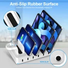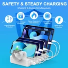 All-In-One Charging Station: Our charging station comes with 6 cables and an apple watch charger holder (watch charging cable is not included) and a Type-A to Type-C Adapter Converter (use for Apple Watch Series 7), perfect for charging all of your electronics in a very tidy, small area. Keep all your devices in one neat spot without having to deal with cables running around everywhere Safety Charging Dock: 6 USB ports can charge 6 devices simultaneously with a max output of 2.4A which amounts to up to 80% faster charging than other regular chargers with 2A or less. UL certificated adapter, overcharging and short-circuiting protection make your all devices fully safe Sturdy & Durable: Our multi charger station is made of high-quality flame retardant ABS material, anti-slip rubber surface protects your devices from accidentally slipping off. 1-inch wide slot and 1.3-inch high divider are strong enough to handle a large tablet with a thick case. It is lightweight and easy to carry for traveling purposes Universal Compatibility: The multiple USB charging station is compatible with your Apple and Android phones, tablets, earbuds, kindles, and other consumer electronics. Can be used at home, office, school, restaurant, and hotels Great Gift Choice: This charging stand is a perfect gift idea for Christmas, Birthdays, Thanksgiving, housewarmings, father’s day and mother’s day Charging Cables Replacement Service: For a better experience, we recommend using the charging cables that come with our products. If you have any problems with them, please feel free to contact us and we are willing to replace the charging cables for you