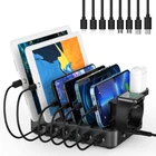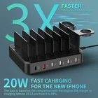 【20W PD USB-C and 18W QC 3.0 Fast Charging】6 port USB Charging Station with 1 PD USB-C and 1 Quick Charge C 3.0 Fast Charging ports.20W PD ports Charge iPhone 13 &12 series and previous models up to 3 times faster than with original 5W Charger.QC 3.0 Rapidly charge your QC 3.0 compatible devices from 0% to 80% in 35 minutes, 50% faster than traditional chargers. Backward compatible with Quick Charger 2.0.deliver the fastest possible charge to almost device. 【7 in 1 Charging Stations】: 6 ports Charging Station designed with and With the new holder for iWatch Charger & Air-pods (PLEASE NOTE: the Watch charger is not included) conveniently store and charging for any 6 devices combination. By one 6 port USB charger station, No more cluttered cables & do not need to plug a bunch of wall chargers on your power outlet,keeps your table nice and clean.and freed up outlets in your home and office. 【8 Mixed Cables Included & Compact Design】The cell phone charging station Comes with 1 usb-c to iphone cables, 1 usb-c to usb-c cable, 3 usb-a to lphone cables, 2 usb-a to micro cable, 1 usb-a to usb-c cable. There is no need to buy extra cable for you devices. USB charging station adopt compact design,keep all devices in one place.make sure it won't take up too much desktop space. 【Multiple Security Protection】: multi usb charger station with over charging,over-current , over-temperature and short-circuit protection.Every port of the charging stations will offer exactly the charging current required to match your devices needs, keeping your phones safe. The phone charging station features a switch and indicator light giving you a quick visual indication that it is powered on. 【Removable Dividers Design】6 ports charger Station adopts stronger baffles,It contains 7 removable baffles and 1 removable earbuds and iWatch charger holder. Detachable Design can be Adjust width easily to any size you need, even the device in the thick cases. Perfect for Kids Edition Tablet with Kid-Proof Case.It's the best Christmas gift for family.Suitable for home use on kitchen counter, desk, nightstand or office, hotel.