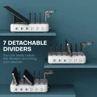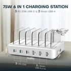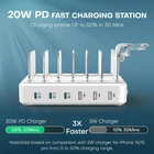 【3 powerful 20W PD USB-C Fast Charging 】: Boasts 3 powerful 20W PD USB-C ports is an standout feature of this USB C charging station,deliver lightning-fast charging speeds for fast charging up to 3 devices simultaneously,can be charge phones up to 50% in about 30 minutes, 3 times faster than the original 5v/1A charger,ensuring that your devices are powered up in no time. NOW more and more phone are no longer include charger, so our fast charging station is a great option for quick charging multiple devices! 【7 in 1 Charging Stations】: 6 ports Charging Station designed with 3 20W PD USB-C charging ports and 3 USB-A ports,conveniently store and charging for any 6 devices combination. By one 6 port USB charger station, No more cluttered cables & do not need to plug a bunch of wall chargers on your power outlet,keeps your table nice and clean.and freed up outlets in your home and office.perfect for families or anyone who needs to charge multiple devices at once. 【7 Mixed Cables Included & Compact Design】The cell phone charging station Comes with 7 Mixed 10 inch Cables Include 1 usb-c to iphone cables, 3 usb-c to usb-c cable, 1 usb-a to lphone cables, 1 usb-c to lphone cables,1 usb-a to micro cable, 1 usb-a to usb-c cable. There is no need to buy extra cable for you devices. USB charging station adopt compact design,keep all devices in one place.make sure it won't take up too much desktop space. 【Multiple Safe and intelligent】 multi usb charger station built in advanced intelligent chip that protects against with over charging,over current,over temperature and short circuit protection.Every port of the charging stations will offer exactly the charging current required to match your devices needs, keeping your phones safe. The phone charging station features a switch and indicator light giving you a quick visual indication that it is powered on. 【Large Space,Removable Baffle Design 】 This Multiple devices charging station is equipped with 7 PCS removable high-hardness dividers,The distance between the dividers is 0.7 inches.Detachable Design and base can be effortlessly separated. Just choose which baffles need then you have enough space to fiddle with your devices,and can be save space,easy to carry on the go. you can turn it off by power button off if do not use this charging station.Suitable for home use on kitchen counter, desk, nightstand or office, hotel. 【What You Can Get】1- Charging Station, 1- Power Cord, 7-Pack short charging cables(1 usb-c to iphone cables, 3 usb-c to usb-c cable, 1 usb-a to lphone cables, 1 usb-c to lphone cables,1 usb-a to micro cable, 1 usb-a to usb-c cable).manuals.