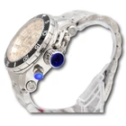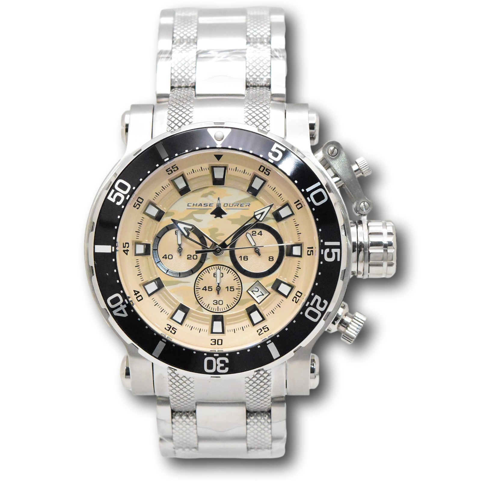 New - With Defects New and Unworn - Small imperfection on the watch bezel near the 8 o clock as pictured - watch is otherwise NEW and 100% Functional Guaranteed Authentic - Includes box and warranty info 100% Functional - This listing includes pictures of the actual watches for sale Made by Invicta, with the same high-quality parts as Invicta watches - these are nearly identical to Invicta watches at a better price! Very luxurious and sharp looking watch - Quality Japanese chronograph movement - luminous hands and hour markers - rotating bezel - protected crown with 100M Water resistance Case size: 52mm, or about 60.5 mm wide including the crown - Thickness: 20 mm thick Weight: about 12.3 ounces Items included: Watch box and warranty info Max wrist size: 8.90 Inches Case & Dial Dial Color Camouflage, Beige, Tan Dial Material Brass Case Size 52 Case Tone Steel Case Material Steel Bezel Function Uni-directional Crown Type Screw Down Luminous Color White Luminous Material New Lite Movement Movement Type Quartz Swiss Made No Movement Components Japan Movement Vendor TMI Movement Caliber VD53 Band Band Material Stainless Steel Band Length (mm) 198 Band Size (mm) 26 Buckle Type Fold over safety Interchangeable Band No Clasp Type Safety