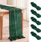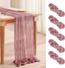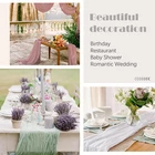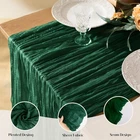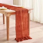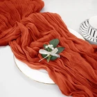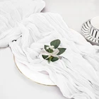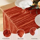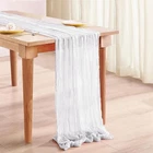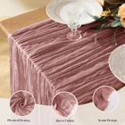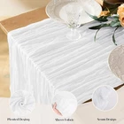 The Cheesecloth Table Runner is a boho-inspired piece made from cotton and linen, measuring 35 inches by 120 inches, making it perfect for bridal shower decorations or wedding festivities. Its rustic charm and gauzy texture add a touch of elegance to any table setting. Ideal for adding a unique flair to your party decor, this table runner is a stylish and versatile choice for special occasions.