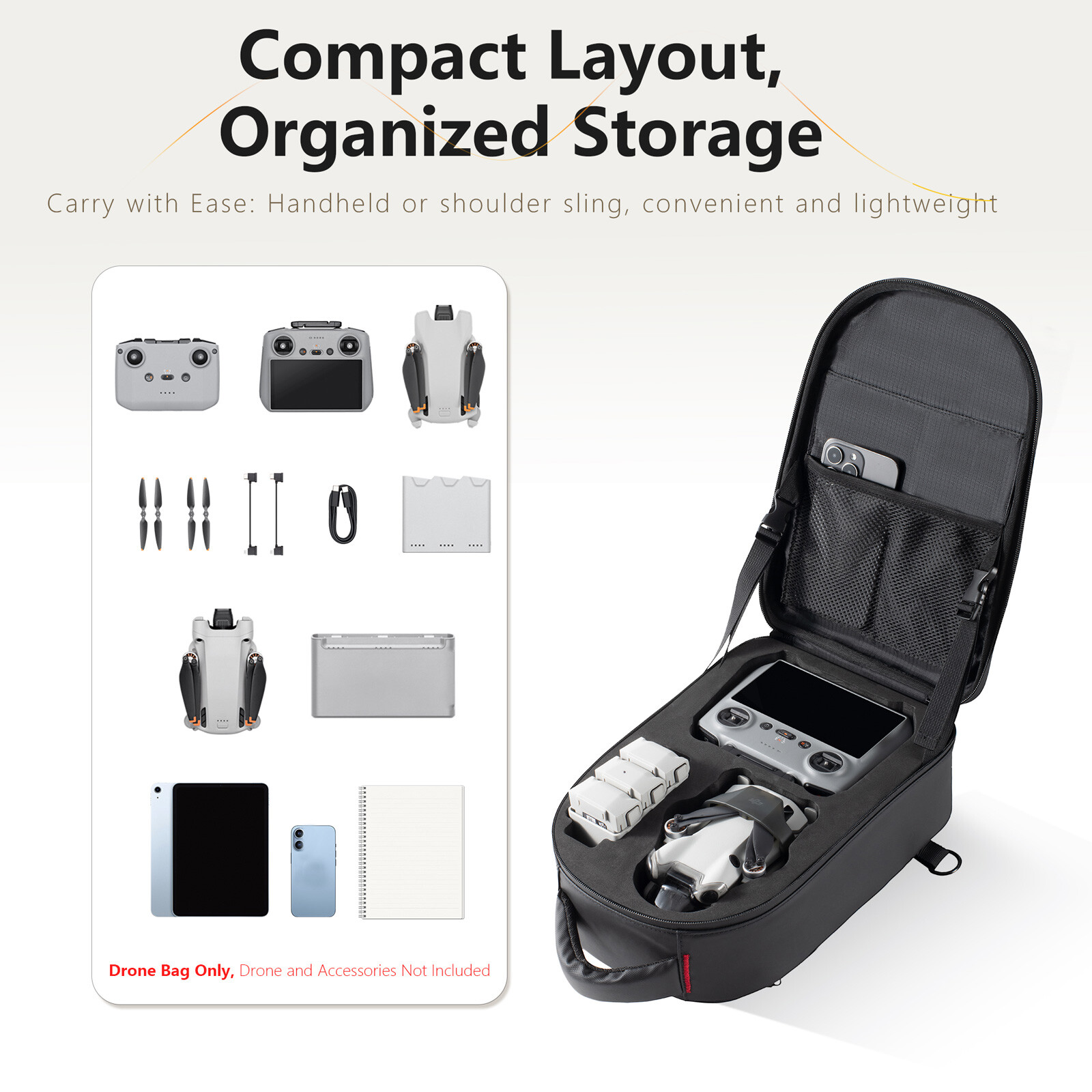 Product Description Mini 4 Pro Case, Portable Sling Backpack Compatible with DJI Mini 3 Pro / Mini 3 / Mini 4 Pro Carrying Case, Travel Mini 3 Bag for DJI Mini 3 Fly More Combo Feature: 【Strong & Stable】— This Backpack Case is made Of high-density material for more durable. High quality precut EVA inner and waterproof PC hard shell secures everything in safety. Protects against scratches, jostles and drops. The high-quality canvas is durable and can better protect your drone. 【Unique Design】— Special storage design for DJI Mini 4 Pro/Mini 3 Pro/Mini 3/Mini 4K/Mini 2 SE Fly More Combo Drone. Large capacity, very useful and convenient to use. Large-capacity backpack, can store Mini series drone, RC-N3/RC-N2/RC-N1/RC 2/RC Remote Controller, batteries, propellers, charger and multiple accessories can be stored, increasing the fun of flying. 【Shockproof & Waterproof】— Designed with a shock-absorbing interior and waterproof zippers, this bag provides extra protection against drops, impacts, and light rain, keeping your gear safe in various conditions. 【Easy to Carry】— This Backpack has an adjustable shoulder strap and handheld strap. Adjustable padded shoulder strap design can relieve pressure on your shoulders. Portable hard shell backpack, you can carry your drone to mountains, buildings, seaside. Whatever scenery you want to see through your drone. (NOT included the drone, remote controller and other drone accessories) Specification: Compatibility For DJI Mini 4 Pro/ Mini 4K/ Mini 3 Pro/ Mini 3/ Mini 2 SE/ Mini SE with DJI RC 2/RC/ RC-N3/N2/N1 Color: Black Material: PC & EVA Weight: 800g Product Size: 37.5*24.5*12.5cm Product List Backpack*1, Instruction Card*1 powered by